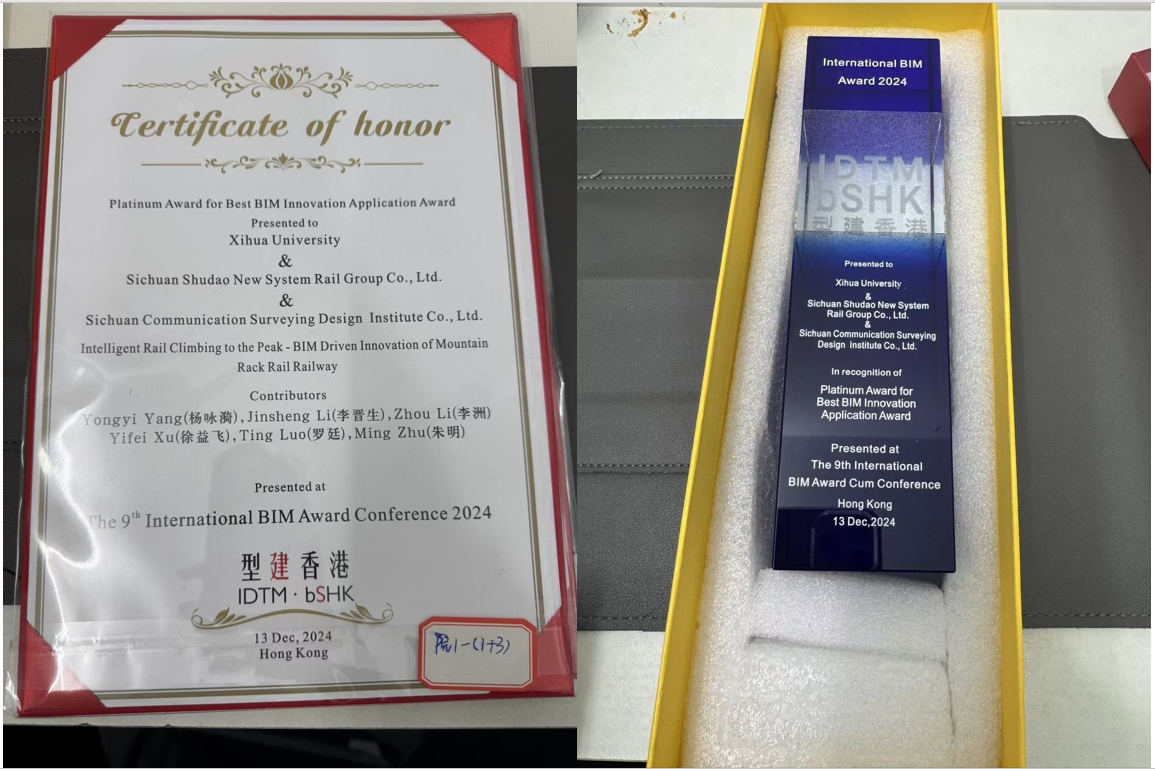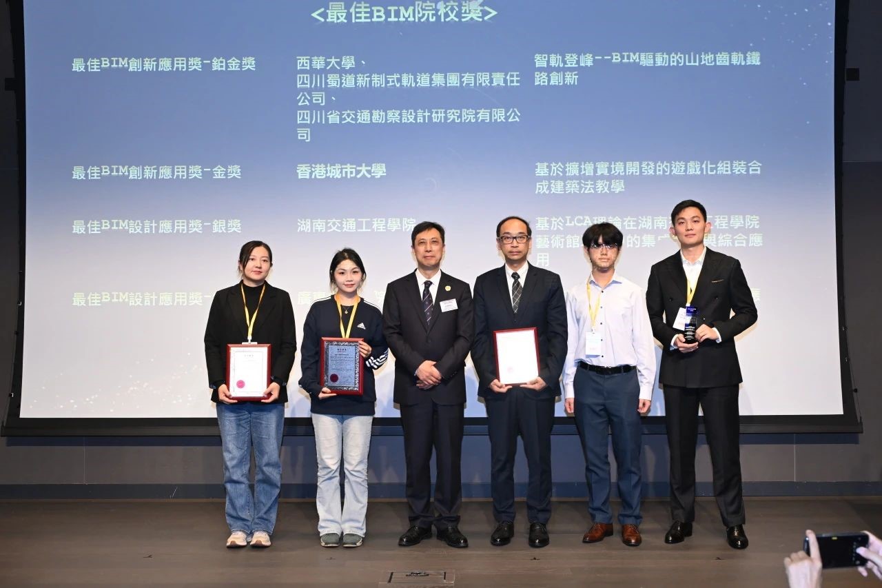 12月13日,由buildingSMART香港(BSHK)主办,香港特别行政区政府数字政策办公室、香港绿色建筑议会、香港建筑署、香港建筑师学会、香港测量师学会、香港科技大学、香港中文大学等多家机构支持的“建筑科技高峰论坛暨第九届国际BIM大奖赛颁奖典礼”在香港西九龙戏曲中心举行。由应急管理学院教师杨咏漪指导,学生李晋生、李洲、徐益飞、罗廷、朱明参与完成的参赛项目“智轨登峰——BIM驱动的山地齿轨铁路创新”荣获院校类最佳BIM创新应用唯一最高奖——铂金奖。