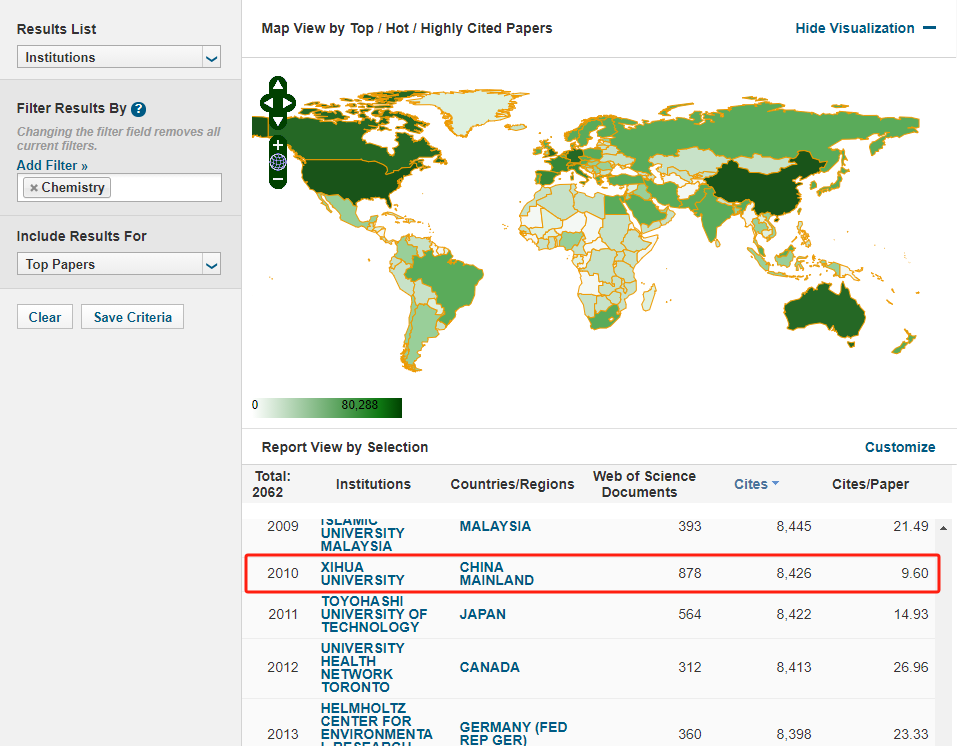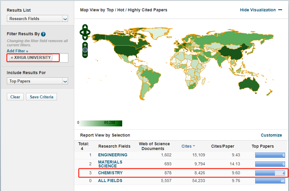 最新ESI数据显示,我校近十年全部学科领域共发表纳入ESI统计论文5557篇,总被引用54233次,篇均被引9.76次,高影响力论文46篇。其中,化学学科领域共发表纳入ESI统计论文878篇,总被引用8426次,篇均被引9.60次。全球进入ESI前1%的机构共有9717个,我校位列3366位(在中国内地科研机构中名列第458位);全球进入化学学科ESI前1%的机构有2062个,我校位列2010位(在中国内地科研机构中名列第384位)。