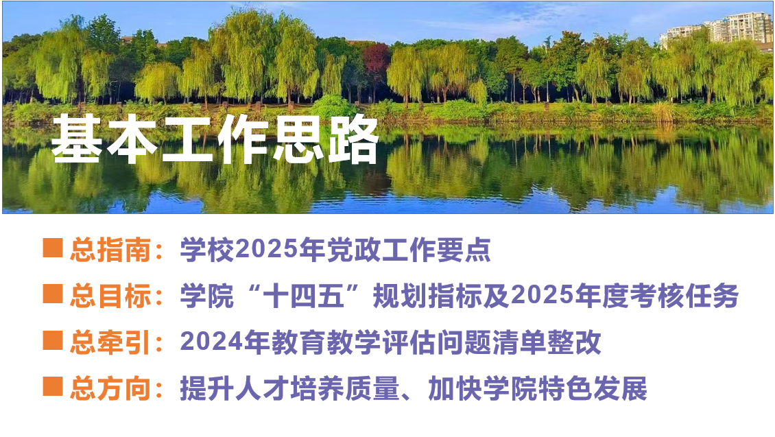 以学校2025年党政工作要点为总指南,以完成学院“十四五”规划指标及2025年度学校下达考核任务为总目标,以2024年教育教学评估问题清单整改为总牵引,着力学院人才培养质量积极提升与专业学科良好发展,加快建设特色鲜明、国内知名的文学与新闻传播学院。