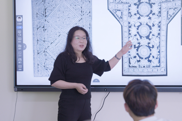 活动伊始,我校美术与设计学院刘俊微副教授以“贵州蜡染纹样”为题,向中印尼学子生动讲述了贵州传统纹样的文化内涵与工艺智慧。她从贵州蜡染的历史源流切入,解析了贵州不同民族和地区蜡染纹样的同异及经典图案中蕴含的自然崇拜、祖先记忆与族群信仰,让在场学生感受到贵州纹样的独特魅力。