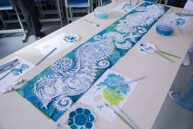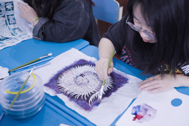 在实践环节,中印尼学生组成小组,以苗族蜡染技艺为基底,尝试将印尼巴迪克的经典纹样与中国传统元素创新融合。中国学生负责蜡刀绘图与染色指导,印尼学生则贡献色彩搭配与纹样组合的灵感。经过小组协作,一幅幅兼具苗族细腻笔触与巴迪克斑斓色彩的作品跃然布上,赢得现场师生连连赞叹。