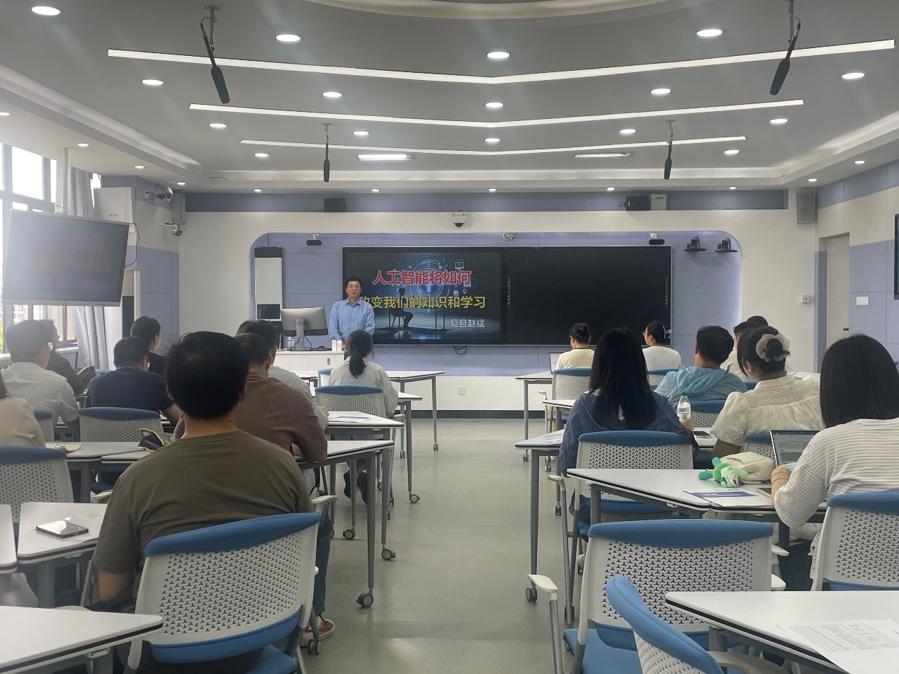 培训特邀复旦大学赵斌教授作专题报告。赵斌教授以“人工智能将如何改变我们的知识和学习”为题,系统阐述了人工智能对高等教育带来的深刻变革。他深入剖析了AI对知识与学习的重塑作用,探讨了从混合式教学向AI辅助智慧教学的实践路径,并结合顶尖学术期刊成果,分享了AI赋能教学的有效机制,为参训教师提升数字化能力提供了坚实的学理支撑与实践指导。