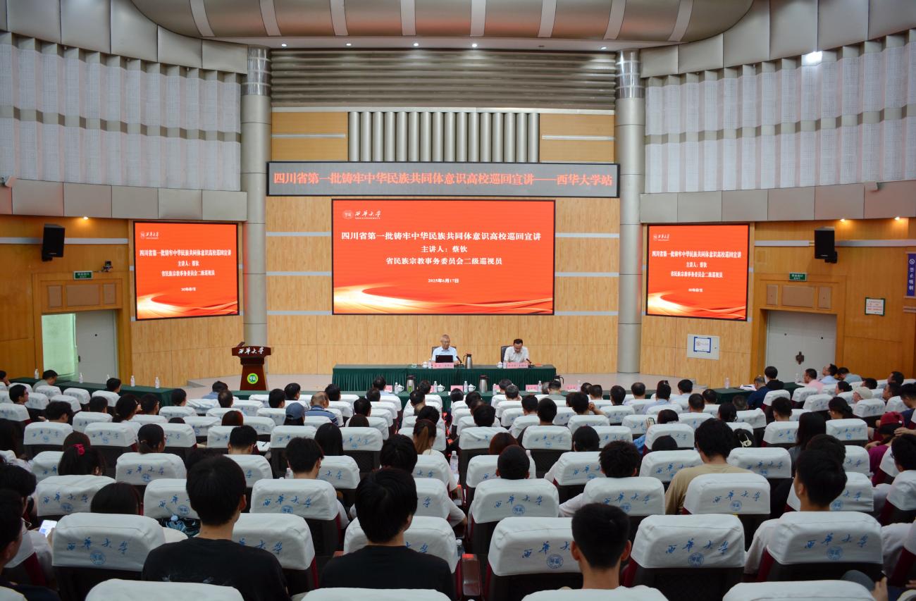 6月17日下午,四川省第一批铸牢中华民族共同体意识高校巡回宣讲tyc41183太阳成集团站活动在四教报告厅举行。四川省民族宗教事务委员会二级巡视员蔡钦作宣讲报告,党委副书记朱兴华主持并作总结讲话。校领导,党群部门副处级以上领导干部,各学院书记,马克思主义学院班子成员、思政课教师代表以及各学院学生代表近300人参加活动。