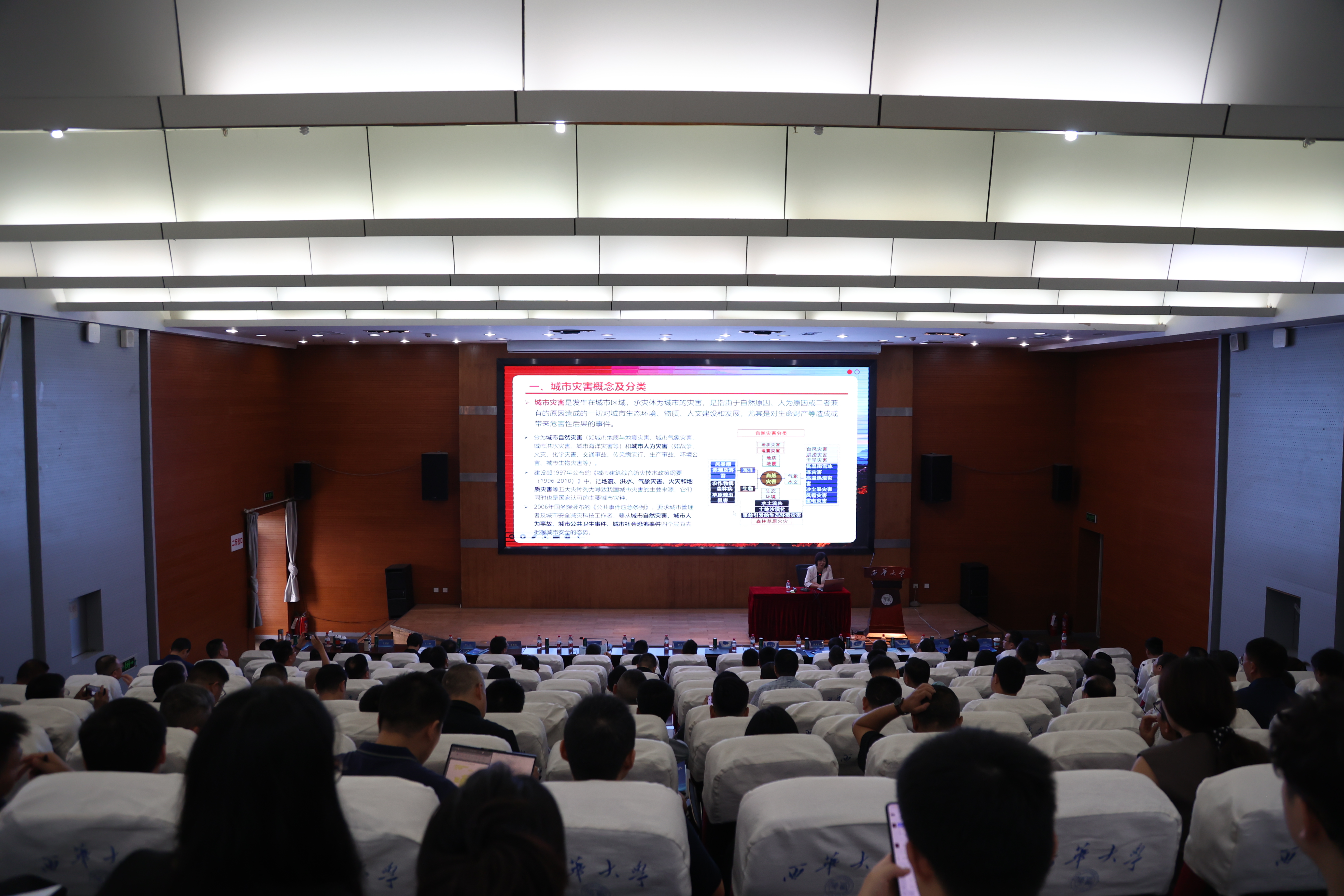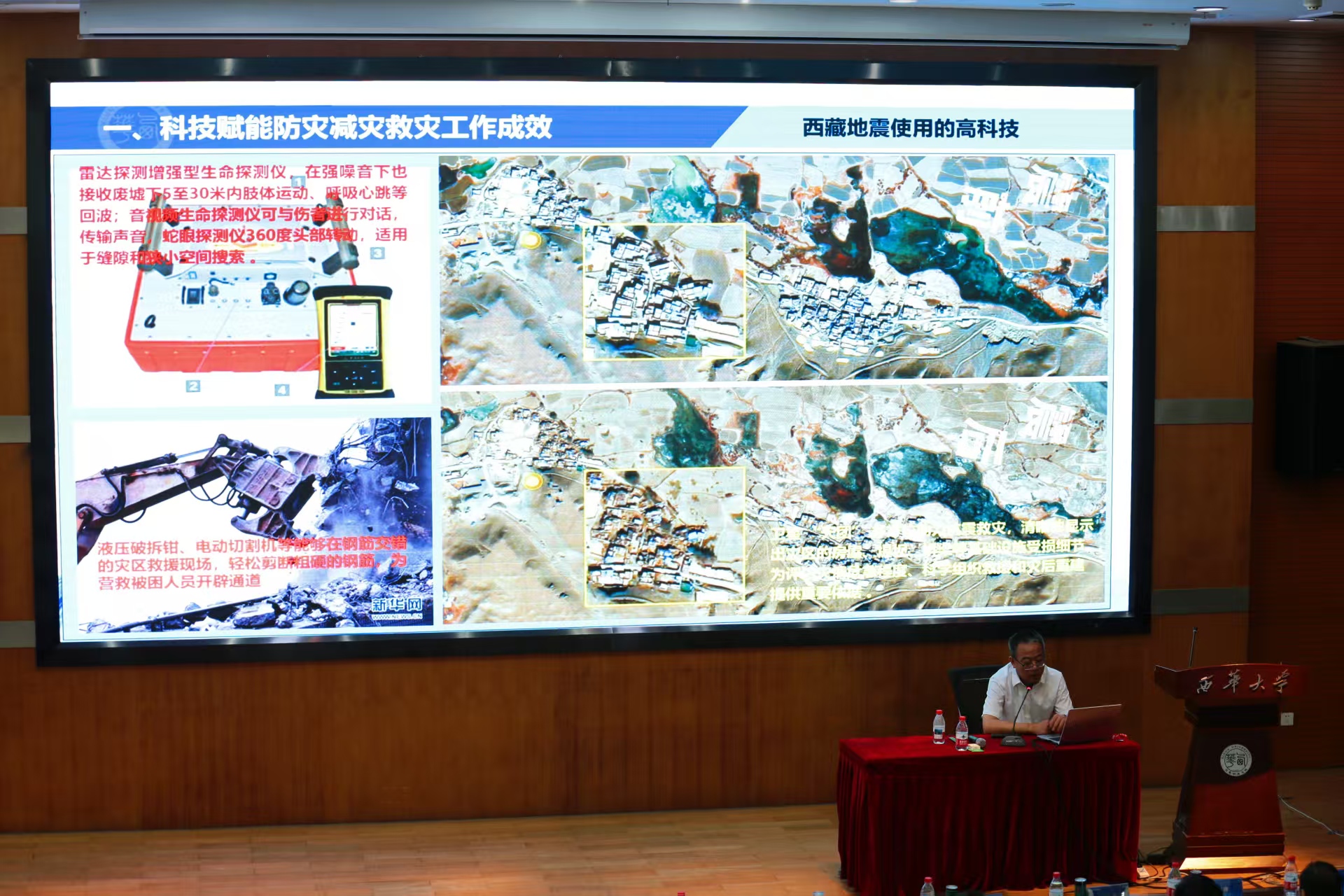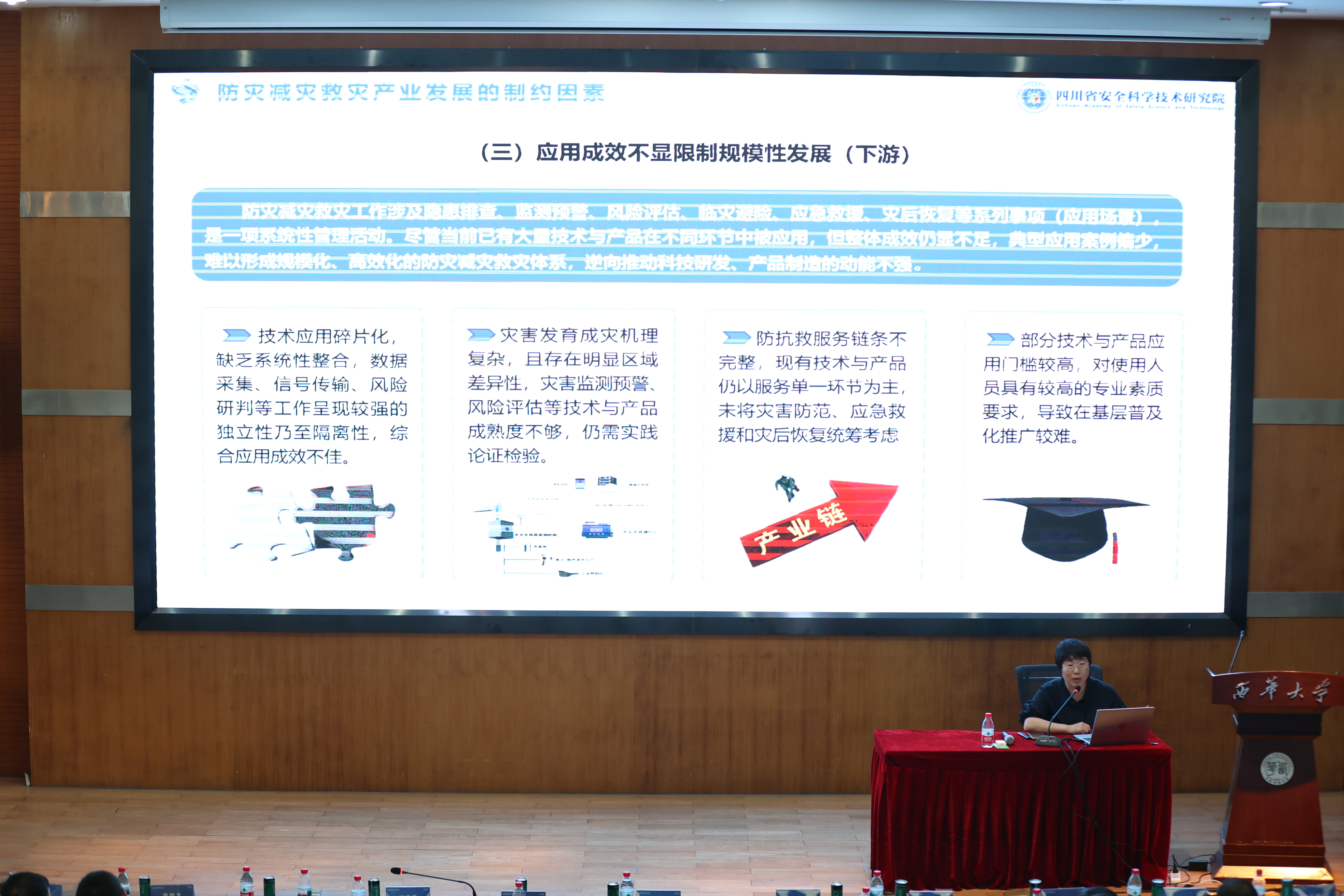 应急管理部国家自然灾害防治研究院城市灾害研究中心副主任朱月琴以《城市智慧防灾减灾研究与实践》为题;武汉大学测绘学院教授级高工、雷达专家张涛以《轻便地基干涉合成孔径雷达的研制和应用》为题;四川大学灾后重建与管理学院副研究员骆晓龙以《科技赋能防灾减灾救灾工作的领域需求与趋势分析》为题;成都理工大学地质灾害重点实验室副教授唐小川以《地质灾害防治与地质环境保护全国重点实验室应急工作汇报》为题;四川省安全科学技术研究院党委委员、正高级工程师王立娟以《科技赋能防灾减灾救灾工作的产业链规划思考》为题;tyc41183太阳成集团应急管理学院院长舒志乐以《科技赋能防灾减灾救灾工作的四川实践》为题;成都高新减灾研究所所长王暾以《自然灾害动态风险预警成效与展望》为题;中物九联化工园区安全顾问何俊以《化工园区安全风险智能化管控建设汇报》为题进行了专题演讲。眉山市应急管理局、雅安市应急管理局分享了科技在防灾减灾工作中应用的成功经验。
