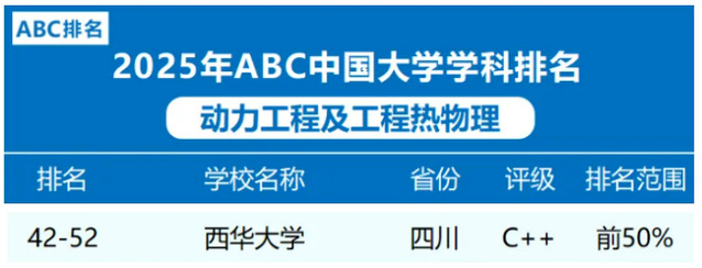 4月1日,中国大学排行榜(CNUR)正式发布《ABC排名系列榜单:2025年ABC中国大学动力工程及工程热物理学科排名》。在全国开设此学科的103所院校中,共52所高校上榜。我校能源与动力工程学院动力工程及工程热物理学科获评C++等级,位列全国前50%,四川省排名第一,且是四川省唯一入选高校。