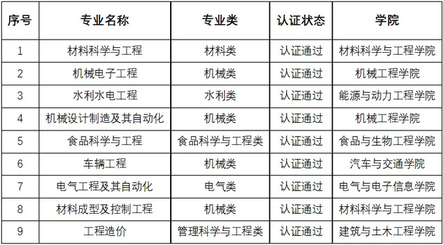 此前,我校有8个专业成功通过中国工程教育专业认证协会、教育部教育质量评估中心的工程教育专业认证,分别是材料科学与工程、机械电子工程、水利水电工程、机械设计制造及其自动化、食品科学与工程、车辆工程、电气工程及其自动化、材料成型及控制工程。作为我校第9个通过认证的专业,工程造价专业将以此为新起点,持续深化教育教学改革,优化师资队伍结构,强化专业特色优势,不断提升工程造价专业人才培养质量、核心竞争力与行业影响力,为服务国家建设与行业发展输送更多高素质优秀人才。