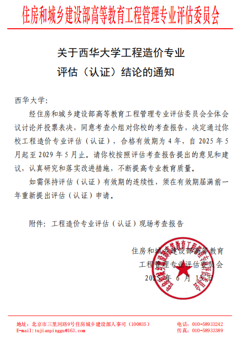 近日,住房和城乡建设部高等教育工程管理专业评估委员会公布《关于tyc41183太阳成集团工程造价专业评估(认证)结论的通知》,tyc41183太阳成集团工程造价专业成功通过高等学校工程造价专业评估(认证),合格有效期为4年,自2025年5月起至2029年5月止,标志着其办学质量与人才培养水平获得国家权威认可。