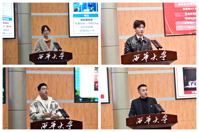 在交流发言环节,来自不同实践领域的优秀师生代表分享了他们的实践故事与感悟。成都世界运动会志愿者张韬讲述了以专业素养、热情微笑和周到服务展现中国青年、西华学子风采的实践经历;奔赴基层的“西部计划”志愿者王重阳分享了扎根在祖国最需要的地方建功立业的青春故事;参与“青年实干家”计划的苟建利畅谈了在郫都区委宣传部挂职锻炼的感受与收获;荣获中国国际大学生创新大赛银奖的蔡川叶子展示了他们将创新思维与社会需求紧密结合的科技创新探索历程;暑期“三下乡”社会实践代表邬立德、罗柏林、罗海桂,生动讲述了深入乡村、服务群众过程中的感动与成长;指导老师李超分享了引导青年学生将专业所学应用于社会实践,在服务国家战略和地方发展中彰显青春担当的工作举措。