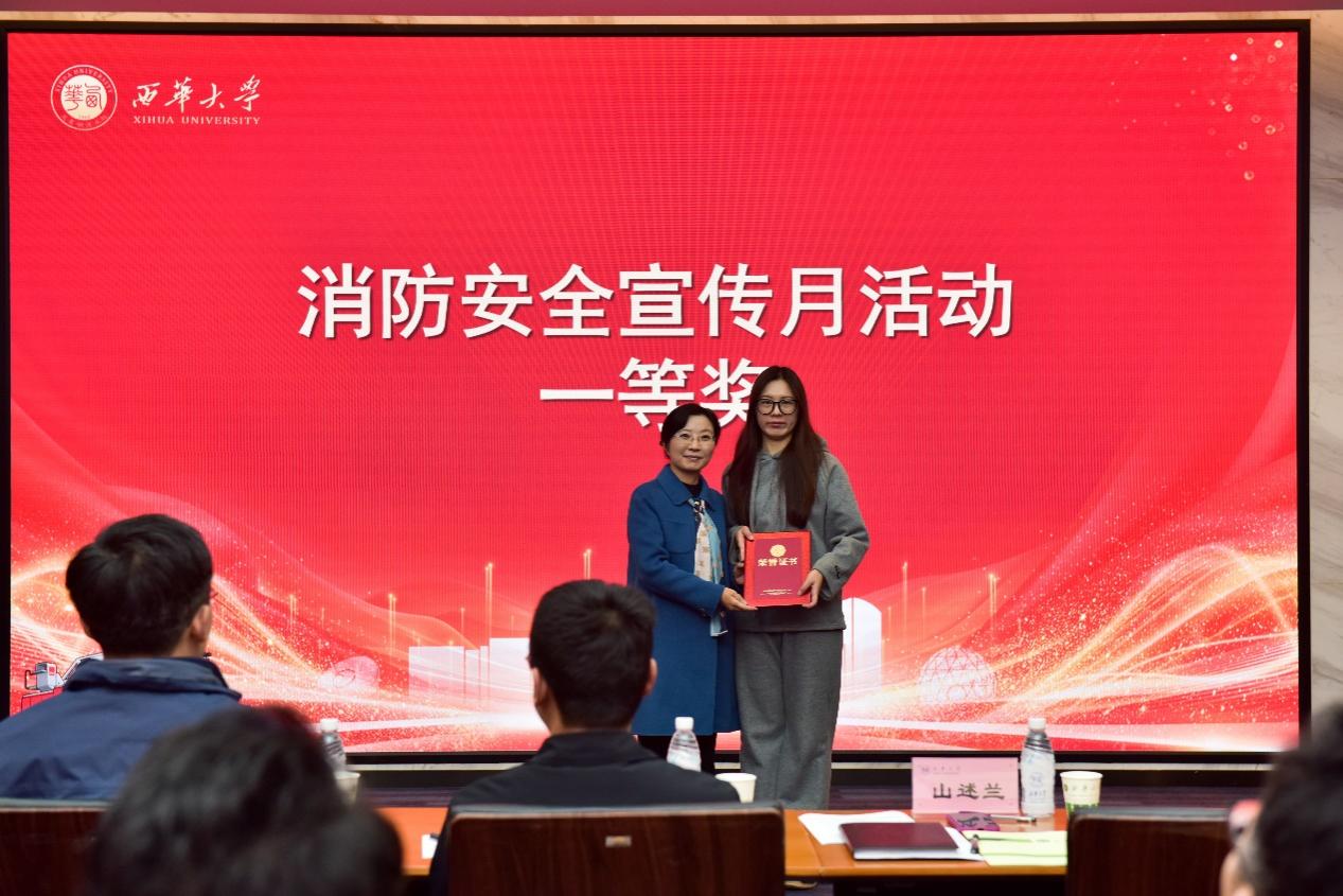 最后,副校长山述兰作总结讲话。她强调,消防安全无小事,校园安全是学校高质量发展的前提和保障;本次消防宣传月活动的成功举办,进一步强化了全校师生的安全红线意识和责任担当。同时,也指出了校园消防安全工作中仍需完善的环节,并对下一步常态化消防安全管理工作作出部署。她要求,各部门、各学院要以此次大会为契机,持续巩固消防宣传教育成果,将消防安全工作融入日常、抓在经常;要不断完善消防安全管理制度,加强校园消防安全隐患排查整治,切实防范化解各类安全风险;要继续创新宣传教育形式,丰富宣传内容,让消防安全知识真正入脑入心,引导全体师生自觉成为校园安全的守护者、参与者和受益者,共同构建平安、和谐、稳定的校园环境。