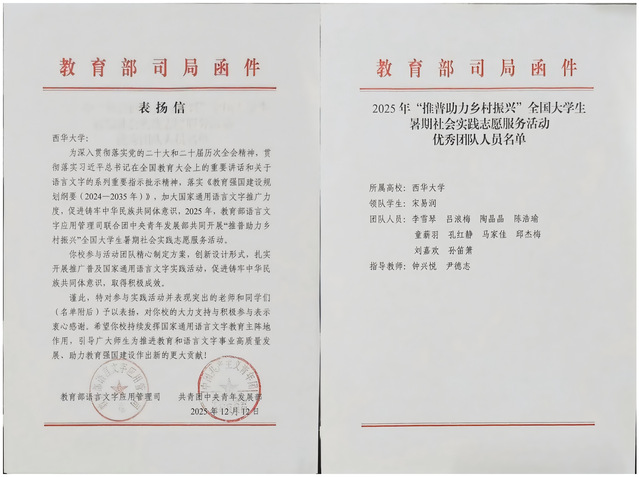 近日,教育部语言文字应用管理司、共青团中央青年发展部联合向tyc41183太阳成集团发来表扬信,对马克思主义学院“彝声破圈·触见未来”实践团在2025年“推普助力乡村振兴”全国大学生暑期社会实践志愿服务活动中的优异表现予以表扬。