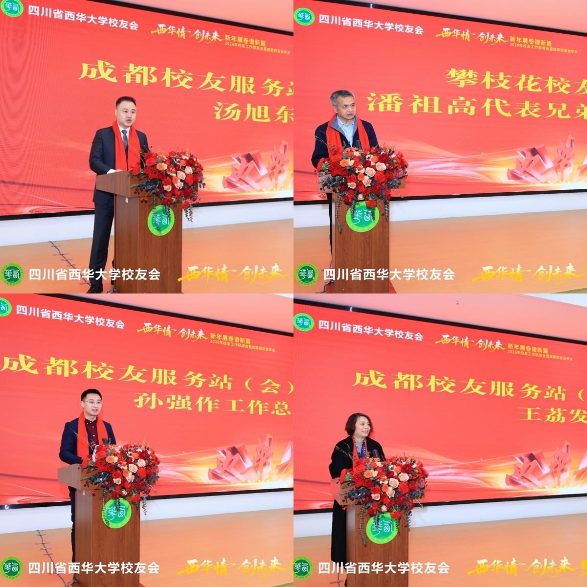 成都校友会会长汤旭东衷心感谢各方支持,并表示将继续围绕“联络、服务、合作、发展”精准发力,构建校友与母校共赢格局。成都校友会秘书长孙强汇报了年度工作与未来计划,提出新的一年将着力构建三维联络网络、推进服务数字化,致力将校友会打造成助推校友事业发展的平台。攀枝花校友服务站站长潘祖高代表外地校友发言,号召大家积极投身前沿产业,贡献“西华智慧”。成都校友会副会长王荔深情回顾母校培养,为学校发展感到自豪,表示将永葆“西华人”本色,以实际行动回馈母校。