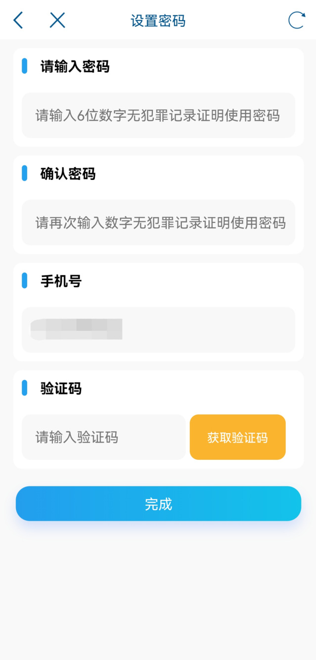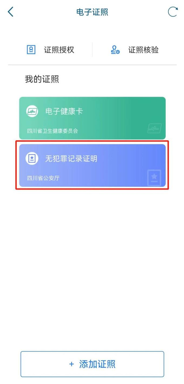 四、添加完成后返回电子证照页面,此时“无犯罪记录证明”添加成功,选择此证明,进入密码设置页面。根据提示输入设置亮证密码、输入手机验证码。