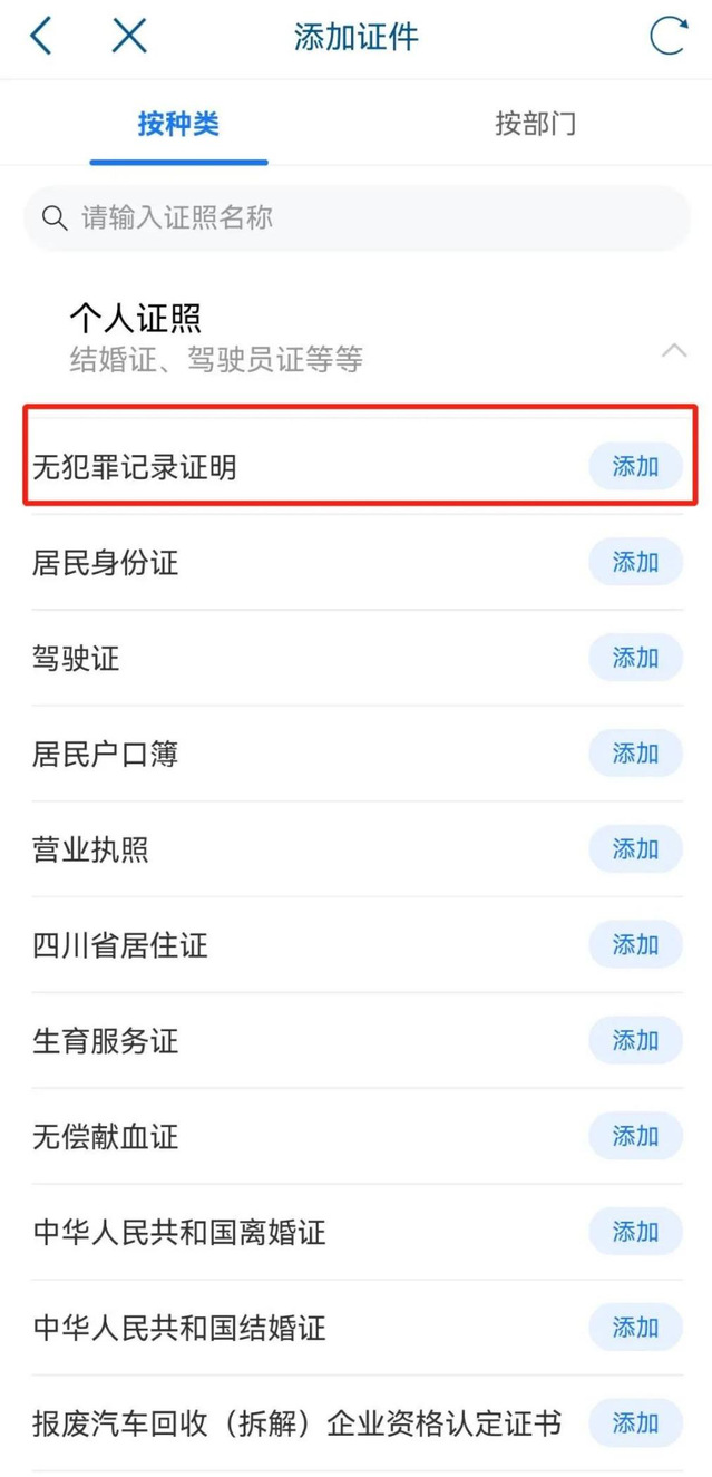 三、点击“添加证照”,在“个人证照”菜单栏下拉选项中选择“无犯罪记录证明”点击“添加”。(也可以根据名称或按部门查找)