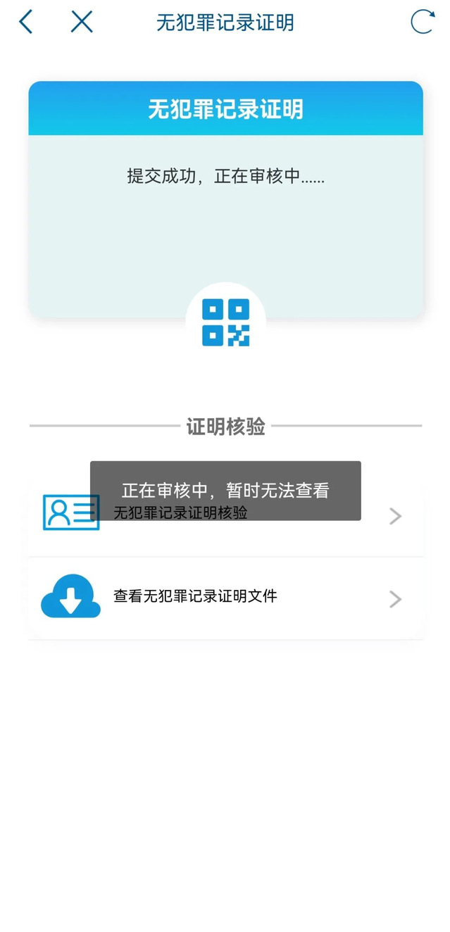 七、提交完成后,系统提示“提交成功,正在审核中......”(正在申请中的证明二维码暂时不可点击)