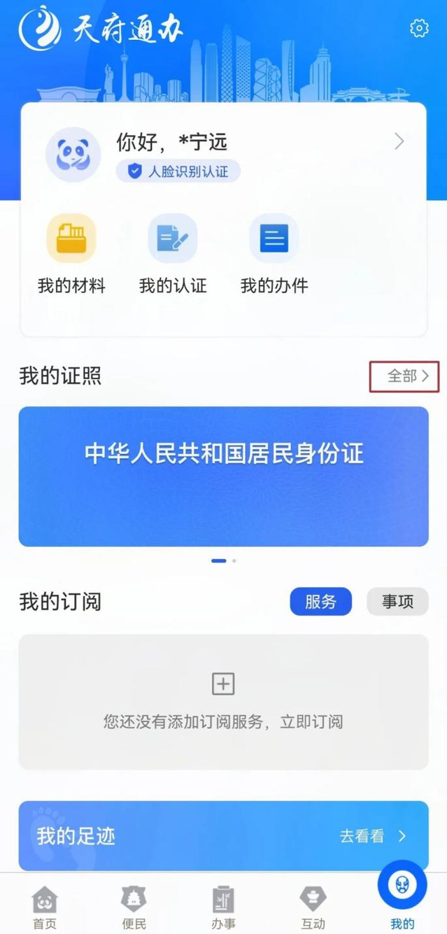 二、认证登录“天府通办”APP 后,点击“我的证照”菜单栏中的“全部”字样,进入“电子证照”页面。