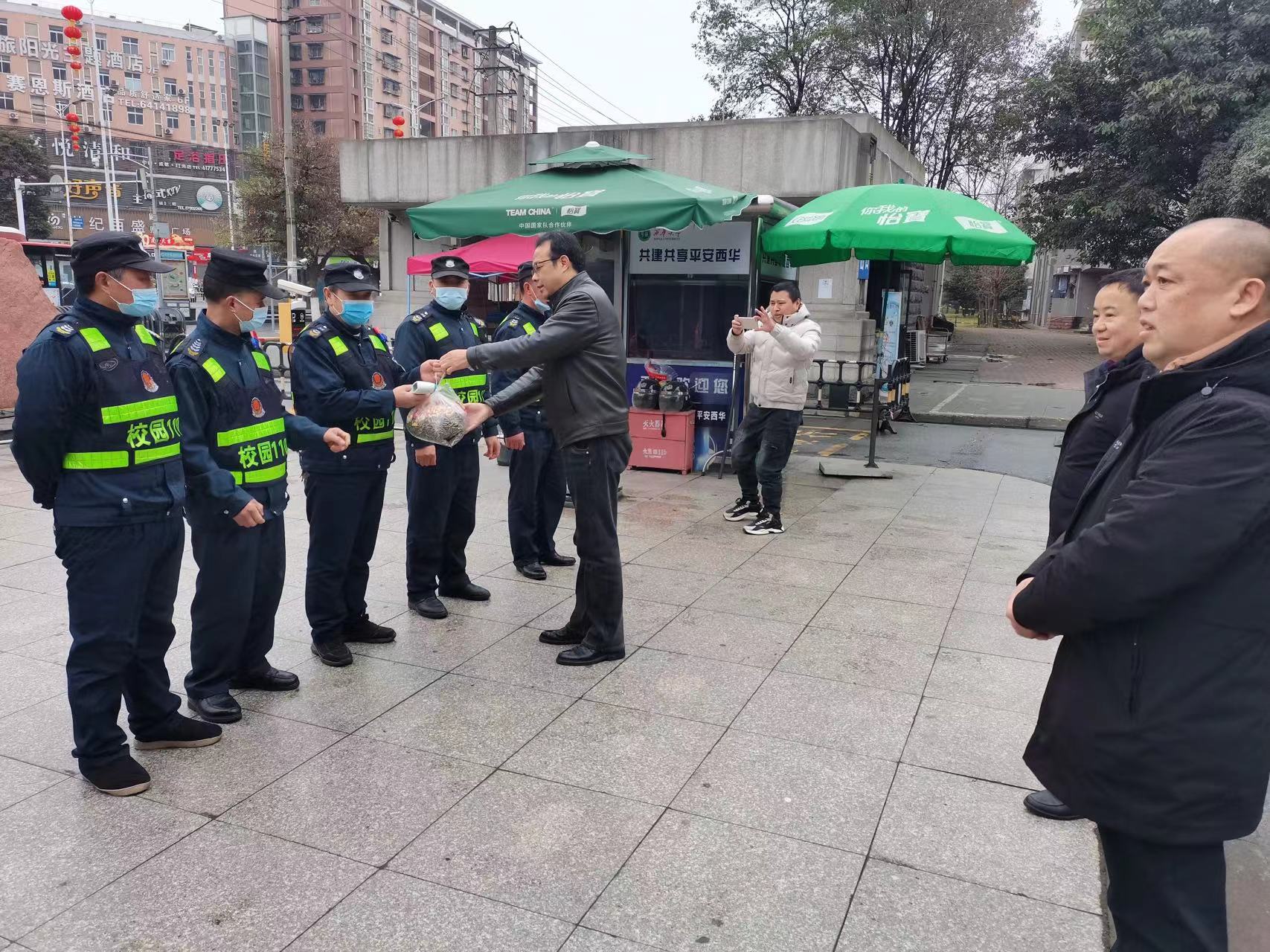 1月28日正值春节来临前夕,党委保卫部罗开春同志、郭胜同志、吴丹同志和何忠同志代表党委保卫部全体干部职工,携礼看望在春节前夕仍坚守在校园各个门岗和区域巡逻的一线安保队员,感谢队员们在此新春佳节期间为全校师生过上喜庆祥和的春节做出的贡献,为大家送上新春祝福。