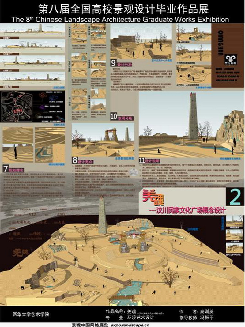 由我校艺术学院冯振平老师指导,秦训英同学设计的《羌魂---汶川民族文化广场概念设计》,在刚刚结束的“第八届全国高校景观设计毕业作品展”中荣获优秀奖。 “第八届全国高校景观设计毕业作品展”是由北京大学景观设计学研究院和中国建筑工业出版社联合组织发起的具有广泛影响的景观专业赛事。全国高校(包括港澳台地区)2012年应届风景园林和景观设计学等相关专业毕业生参加了此次大赛。大赛共收到来自全国各地163个院校的544件作品。本届评审从作品的独特性、创新性、应用性、表现性等方面,认真审核评议确定奖项,最终评出优秀奖108名、荣誉奖7名、单项奖43名 。 此次参赛,使景观设计专业的师生们拓宽了视野,了解了国内各兄弟院校在景观教育方面的特色和取得的成绩,促进了兄弟院校的学术交流与学科发展。 据悉,该作品还获得了2012年第十届中国环境设计学年奖景观设计最佳设计优秀奖。 相关链接:http://www.landscape.cn/edu/CLAGWE/Levy/8th/jiang.asp http://www.design1881.com/_d275369986.htm