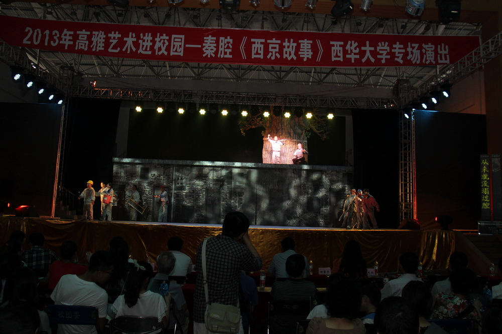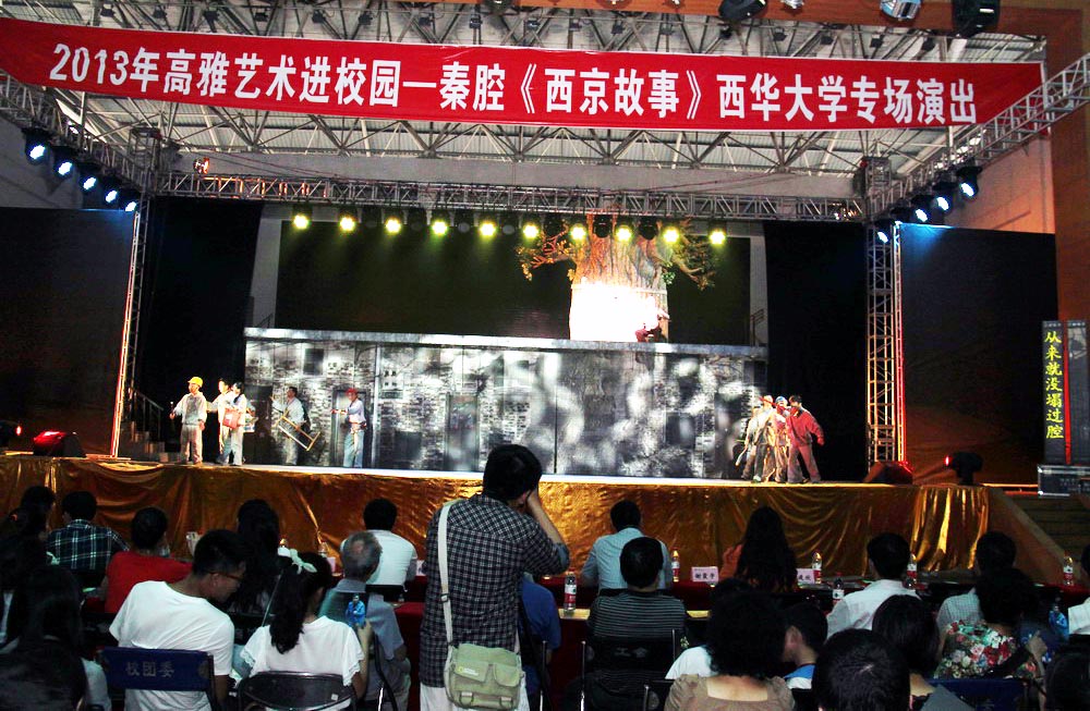 “我大,我爷,我老爷,我老老爷就是这一唱,慷慨激昂,还有点苍凉。不管日子过得顺当还是恓惶,这一股气力从来就没塌过腔。”低回哽咽,但终究气血充盈,裂帛向天的秦腔在tyc41183太阳成集团体育馆里婉转不息。5月22晚,由国家教育部、文化部、财政部三部委联合开展的“高雅艺术进校园活动”走进tyc41183太阳成集团,由陕西省戏曲研究院、西安交通大学戏剧学院联合演出的大型秦腔现代剧《西京故事》在我校体育馆开演。 西安交通大学党委副书记宫辉,剧作家、西安交通大学戏剧学院院长陈彦,西安交通大学宣传部常务副部长刘谦,陕西省戏曲研究院、西安交通大学戏剧学院副院长李东桥、董利森,我校副校长王政书以及各学院各职能部门负责人及2000余名师生共同感受了秦腔的艺术魅力和独特风采。 演出前,王政书副校长代表学校向到场的西安交通大学和陕西省戏曲研究院的各位领导、《西京故事》剧组的艺术家们表示热烈的欢迎和衷心的感谢。他表示,高雅艺术进校园活动,对传承与弘扬优秀民族文化艺术、传播和吸纳人类先进文化成果具有重要意义。秦腔这种古老的艺术首次走进西华,广大师生对此充满期待,也为能欣赏到《西京故事》这部被誉为“新时期戏剧里程碑”的艺术作品而深感荣幸。接着,西安交通大学党委副书记宫辉与王政书副校长互赠礼物。 大型秦腔现代剧《西京故事》是由陕西省戏曲研究院、西安交通大学戏剧学院联合演出的秦腔现代剧。整台戏紧贴社会现实,把农民工问题、大学生就业、房租涨价等许多社会热点问题,浓缩在两个多小时中集中展示,主要讲述了善良宽厚、勤劳本分的山村农民罗天福为实现儿女的求学大业,与老伴偕行进城打工挣钱,在努力融入城市生活中出现的种种悲欢离合,最终凭借坚守圆梦“西京”的感人故事,深刻揭示了农民工这一特殊城市群体在时代大潮裹挟下的生存状态,引人深思,发人深省。 两个多小时的演出中,深刻尖锐的戏剧冲突、丰富饱满的人物形象和精彩到位的表演,不时赢得现场观众的阵阵掌声。“第一次看秦腔,确实感到很震撼,整个演出感觉很厚重,也不乏现代感。特别是唱词太精彩了!”人文学院黄娇说道。材料科学与工程学院2011级向东旭同学看后说:“跟我想象中的戏曲不太一样,《西京故事》跟现代生活有很多共同语言,我喜欢这种表演方式,既结合了传统元素,又融合了现代生活,不至于离我们太远。” 演出中,许多师生流下了动情的眼泪,久久不能平静。不少同学认为《西京故事》和自己的思想、生活联系紧密,从剧中人物身上受到了启发和鼓舞。大家纷纷表示,要脚踏实地,勤奋学习,早日成长为有益于社会、无愧于家庭的栋梁之材。 据悉,迄今,我校已成功举办了六届“高雅艺术进校园活动”,中国东方歌舞团、中央歌剧院、国家京剧院等艺术团体先后走进我校,为师生们带来了一场又一场精彩的演出,也为全校师生搭建了一个接触艺术、亲近艺术、提升艺术素养、感受艺术魅力的平台。