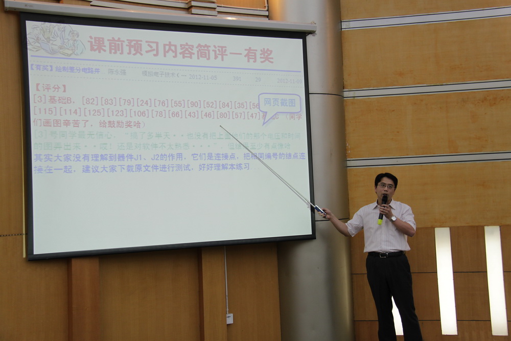 4月25日下午,tyc41183太阳成集团示范课程公开课在四教报告厅举行。我校示范课程负责人陈永强、王秀华老师担任此次示范课程公开课的主讲老师,校长孙卫国、各学院分管教学副院长,系主任、教研室主任、教学办主任,获教学优秀奖教师、省校级教学名师,各学院督导组长,2010-2013年所有新进硕士、博士教师,学校督导团成员和教务处科长以上干部观摩了本次公开课。教务处处长马力主持公开课。 2011年,学校启动示范课程改革,陈永强老师和王秀华老师分别是我校“模拟电子技术”、“C/C++程序设计”示范课程的负责人。两位老师生动流利地课程讲解,赢得了现场听课老师的掌声,并带给大家教学方法的启迪。 在本次公开课上,陈永强老师讲解了其示范课程中“差分式放大电路”部分的内容。陈老师将课堂重点、课前预习、问题引入、问题讲解及讨论贯穿起来,以深入浅出、活泼生动的方式对课堂内容进行讲解,并不断引导学生思考问题,在课堂最后向学生提出思考题并引导学生进行课外阅读。此外,陈老师还向大家介绍了对学生进行随堂测验的方法。 王秀华老师讲解了其示范课程中“数组”部分的内容。王老师以向学生提出实际问题的方式,将学生引入对问题的认真学习和分析思考,并以形象生动的Flash动画讲解冒泡排序法,下课前王老师向学生提出了新问题以激发学生课后的进一步思考与拓展。 虽然两位老师讲课内容不同,但在讲课方式和思路上有许多相似之处。首先,两名教师教学方法包含了优质课的基本要素:导入、讲授、启发、测试、总结,使学生在短时间内掌握课堂内容,形成知识结构体系。其次,充分利用了网络平台,老师们事先将预习内容和教学资料上传到课程中心平台,学生到课程中心下载资料,自主学习。网上自测也替代了传统的随堂测试,其优势在于一方面减轻了老师批改作业的负担,另一方面自测结束后可以马上揭晓答案,便于学生及时纠错改错。最后,在课堂中间适时地引导学生探讨问题,鼓励学生积极思考,使学生有目的、有成效地学习。两位老师清晰的教学思路、精美的教学课件、流畅的语言表达,吸引了在场老师的注意力,取得良好的示范效果。 孙校长对两位老师的示范课作了充分肯定。随后,孙校长作了关于《实施必要改革举措 提高课程质量》的报告。孙校长从国家和社会对高等教育的期望、课程质量保障关键要素的国内外比较以及提高课程质量的必要改革举措等方面,与现场听课老师进行了交流,并希望每位老师都能站在学习对象(求知者)的角度去准备教学(备课),教好书,育好人。 会后,老师们纷纷表示,通过举行示范课程公开课的形式能更好地提高教学质量,尤其是新进教师通过这样的方式能学到更多的教育教学方法。交通与汽车工程学院的新进教师刘洪谈到:“通过观摩示范课,受益匪浅。结合自己的教学实践,深刻地认识到自己在备课、授课等方面的不足,找到了自己在教学中许多需要改进和提升的地方。希望学校多举行示范课,引导我们年轻教师更快进步!”。机械工程与自动化学院的新进教师唐莉娟说:“一个优秀的老师,不光应对教材熟悉,也要对学生关注,根据教学对象的不同适时调整自己的教学思路和方式。作为在教学上的新兵,我也应该多向前辈学习,不断提高自己的教学水平”。 为促进我校教学改革,提高教学质量,展示优秀教师教学风采,学校举办了本次示范课程公开课,达到了预期的效果。据悉,学校将不定期邀请优秀教师为全校老师上公开课。