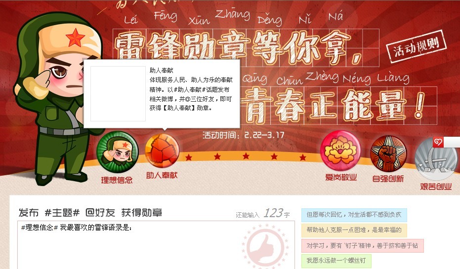 “助人为乐、爱岗敬业、勤俭节约、见义勇为、自强创新”,让我们一起点亮雷锋勋章,用微博传递青春正能量。还等什么呢?赶快行动吧!