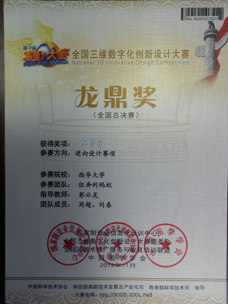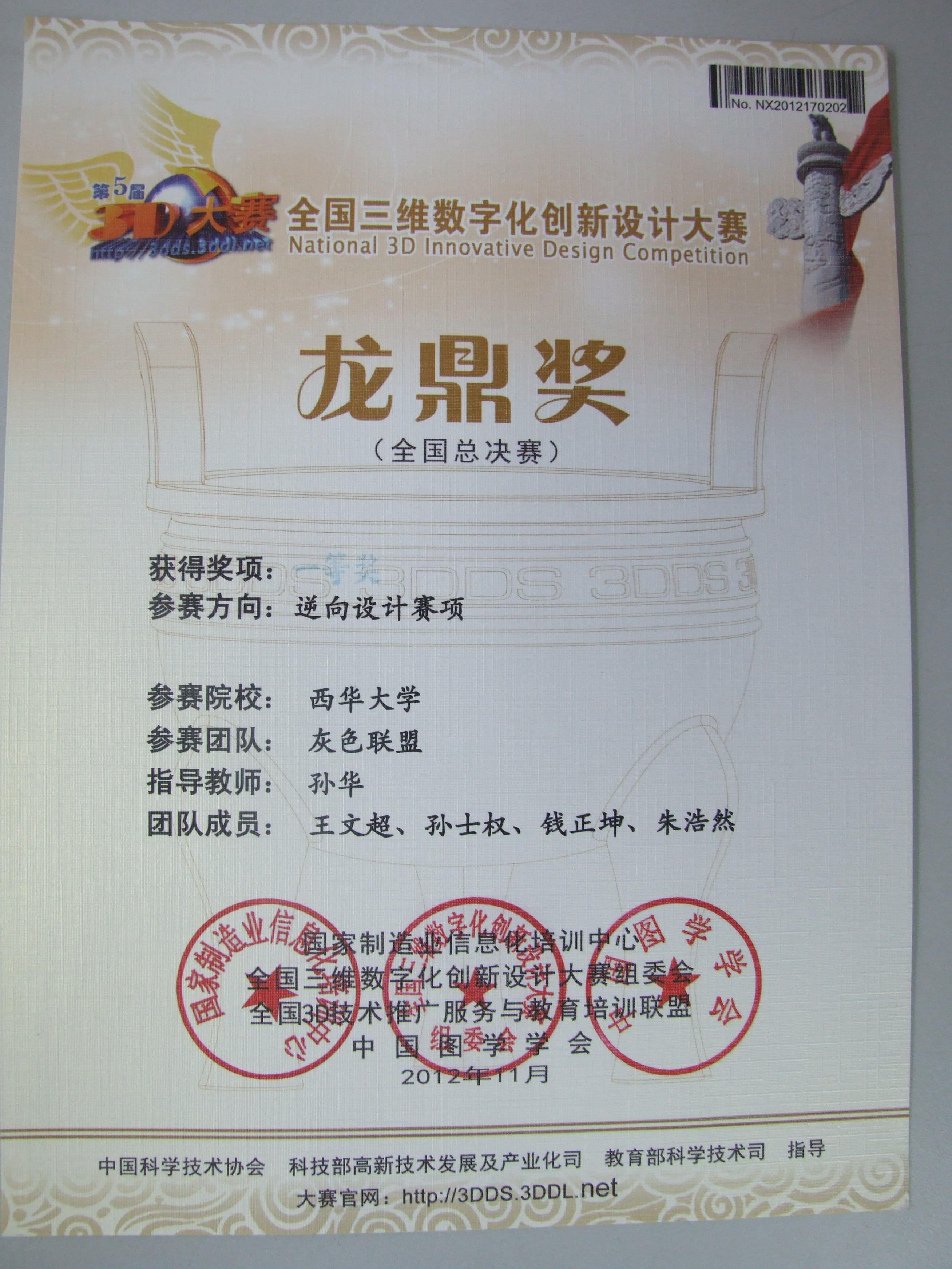 日前,从2012第5届全国三维数字化创新设计大赛总决赛传来消息,由我校机械工程与自动化学院孙华老师指导的王文超、孙士权、钱正坤、朱浩然四位同学组成的“灰色联盟”团队,获得了逆向设计赛项的全国一等奖;材料科学与工程学院学生在彭必友、查五生两位老师的指导下,获得了两项全国二等奖、一项全国三等奖。