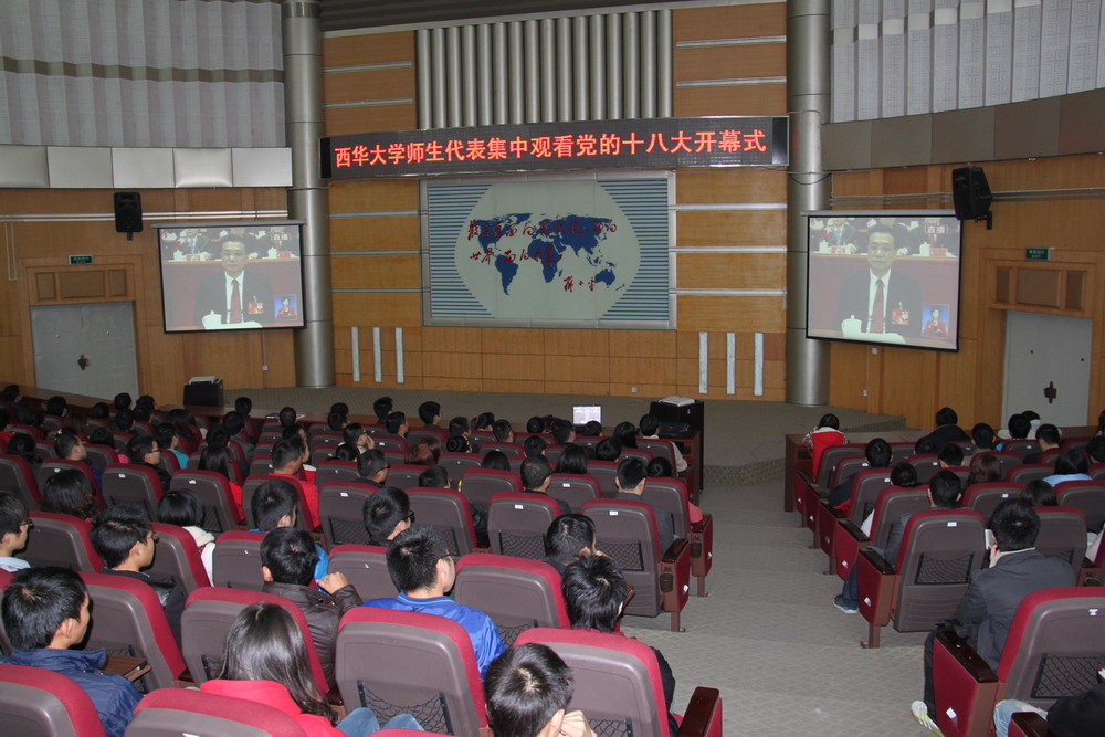 上午9时,胡锦涛同志代表十七届中央委员会作了题为《坚定不移沿着中国特色社会主义道路前进 为全面建成小康社会而奋斗》的报告。从学校领导到普通干部,从教师到学生,大家都认真收听收看十八大开幕盛况。 按照学校党委的部署,学校设立了会议室、学术报告厅、学生食堂、校本部明德广场电子屏等多个收视点,师生员工通过电视、网络认真收听收看了大会现场直播。 在行政楼212会议室,学校党委理论学习中心组全体成员怀着激动和喜悦的心情,集中认真观看了十八大开幕式盛况,聆听胡锦涛同志的报告。校党委书记张小南说:“胡锦涛同志的报告,给我留下了三个突出印象:第一,报告全面总结了党的历史经验,深刻总结了改革开放三十多年来的历史经验,强调在发展的现阶段,要始终坚持走有中国特色的社会主义道路;第二,始终强调在发展过程中,要坚持科学发展观;第三,十分关注民生问题。” 随后,张书记就学习宣传贯彻十八大精神作了安排。学校党委中心组在听取报告的基础上先自学,之后安排时间集中学习讨论。学校各单位要结合工作实际,认真学习领会讲话精神,并将学校学习领会党的十八大精神的情况及时整理上报省委教育工委和教育厅。 上午8:40,四教报告厅座无虚席,各学院领导、专职辅导员,学生工作后备人才及学生代表在此集中收看十八大开幕盛况。师生们聚精会神地听报告,不少观众还时不时做笔记。 在明德广场的大显示屏下,站着一群群认真观看十八大的同学们,他们仰头凝视着屏幕,专心致志。在观看的人群中,有一个女生在观看的时候一直保持微笑,她是来自人文学院的张春梅。她说:“十八大报告表达出一个强烈的信念——坚定不移高举中国特色社会主义伟大旗帜,既不走封闭僵化的老路、也不走改旗易帜的邪路。我们每一个公民都要对中华民族的伟大复兴充满信心,因为有信心,所以我很激动”。 在学生寝室,同学们围着电脑共同收看十八大开幕式,物理与化学学院的李帆同学说:“今天一大早我就起床了,把电脑打开,就一直在收听直播前的新闻,期盼着十八大的开幕。” 在学生食堂,师生们拥坐在电视机前,认真收听收看胡锦涛同志报告,情不自禁地为精彩报告热烈鼓掌。 在教师办公室、在图书馆电子阅览室等地方,广大师生通过新华网、人民网、网络电视台等网站,认真收听收看胡锦涛同志的精彩报告。 师生热议党的十八大