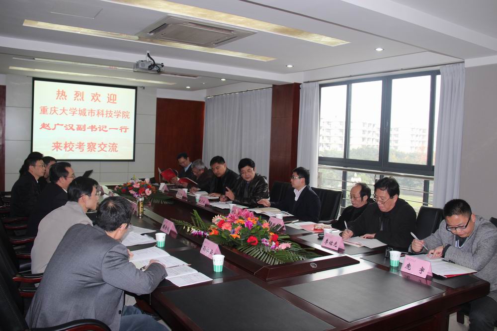 11月22日下午3:00,重庆大学城市科技学院党委副书记赵广汉率队来访我校。副校长何建平在行政楼412会议室热情接待了赵广汉副书记一行,教务处副处长何太碧、数学与计算机学院副院长陈广贵、电气信息学院副院长魏金成、机械工程与自动化学院副院长蔡长韬、交通与汽车工程学院副院长孙仁云参加了座谈交流会。