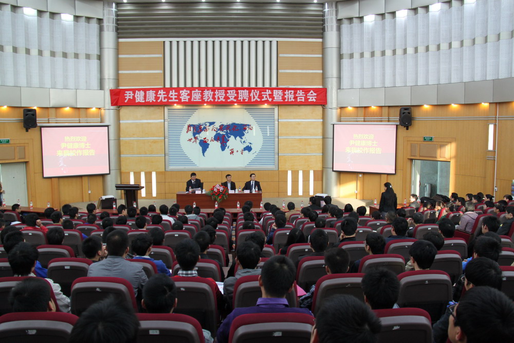 报告会开始前,学校举行客座教授授聘仪式,副校长蔡汉军向尹健康校友颁发了客座教授聘书,并详细介绍了尹健康校友的成长经历及其对校友总会的大力支持。机械工程与自动化学院院长王进戈主持授聘仪式。