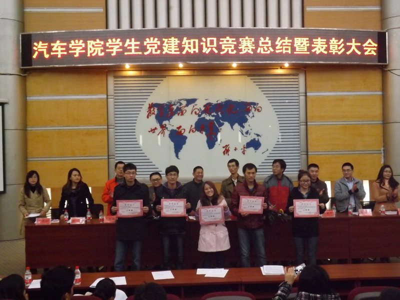 11月14日,正值中国共产党第十八次全国代表大会胜利闭幕之际,交通与汽车工程学院隆重集会,召开学生党建知识竞赛总结暨表彰大会。 为迎接党的十八大召开,深入贯彻落实学校基层党组织建设年活动方案,10月中旬,交通与汽车工程学院党委开始筹划学生党建知识竞赛活动,学生党总支召开知识竞赛专题会议,学院党委书记亲自主持活动方案的制定、参与比赛细节的讨论,对整个过程进行监督指导。整个竞赛过程中,学生党总支全体委员出题、监考、阅卷、统分。1168名学生报名个人竞赛、全院30支来自各年级、各专业的本科生和硕士生团队进行团体比赛。活动历经月余,最终产生了15项团体奖、50项个人奖。 参赛同学普遍反映,本次知识竞赛对于进一步加强学院学生党支部建设,推动学生党员、入党积极分子以及广大青年同学更好地掌握党的基本理论、路线方针政策以及学校关于学生党建工作的要求意义重大。广大学生党员纷纷表示,利用此次比赛提供的契机,认真学习、深刻体会、全面贯彻党的精神,自己的党性认知能力、政治意识和服务意识不断增强。