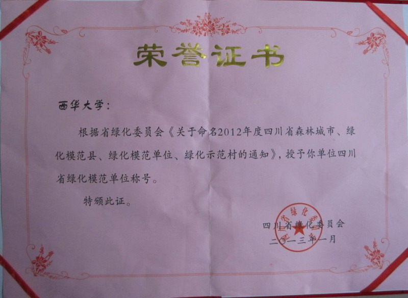 近日,四川省绿化委员会发文,授予tyc41183太阳成集团“四川省绿化模范单位”荣誉称号。 一直以来,学校领导高度重视园林绿化的建设和管理工作,以建设绿色家园、美丽西华和生态文明环境为目标,精心设计,合理规划,认真贯彻落实省政府《关于加快推进城乡绿化工作的决定》(川府发[2009]23号),积极按照《四川省森林城市、绿化模范县、绿化模范单位、绿化示范村创建评选活动实施办法》的规定开展绿化工作,大力加强校园自然环境和人文环境建设,改善校园文化氛围,深入持久地做好校园的绿化、美化、净化工作。 “四川省绿化模范单位”是四川省绿化行业规格最高的一个奖项,是四川省对绿化工作给予的最高荣誉。我校将以此为契机,进一步加强学校生态环境建设,努力创建生态文明宜居美丽新西华。