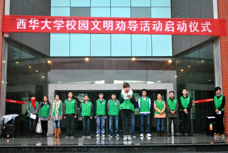 今年是雷锋同志逝世50周年,为了弘扬社会主义核心价值观,不断提升广大学生道德素质和校园文明程度,结合我校学雷锋活动总体安排,3月4日上午,由校学生会发起的校园文明劝导活动在明德广场正式启动。 上午8:00,冒着蒙蒙细雨,身着“文明校园 从我做起”绿色服装的校学生会和各学院学生会的文明劝导队队员齐聚明德广场,主持人简单介绍了本次活动的意义和安排,校学生会主席刘嗣立同学宣读了“文明校园,从我做起”倡议书。之后,校园文明劝导活动正式在全校铺开。 按照划分好的责任片区,各学院学生会组织主要学生干部组成校园文明劝导服务队,深入到校园各个角落开始了牛皮癣的清理、草坪中垃圾的拾捡、对校园不文明行为的劝导等活动。 据悉,此次活动是校学生会开展学生干部向雷锋学习、带头创先争优、为团旗添光彩的系列活动之一,目的是在校内形成人人爱护校园,争做活雷锋的校园文化氛围。即日起,校园文明的劝导活动将在校园形成常态化,各学院将组织学生干部和志愿者长期在校园内按划定的区域,定期或不定期在校园各区域开展文明劝导活动。同时,校学生会希望全校同学都积极参与到文明校园的建设中,为文明西华的创建作出贡献。 启动仪式 清理牛皮癣 拾捡垃圾附:“文明校园,从我做起”倡议书