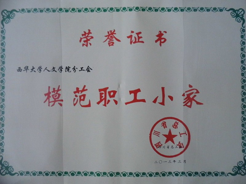 今年初,四川省总工会在全省工会系统进行了2013年基层工会 “模范职工小家”建设评比,我校推荐的人文学院分工会荣获“模范职工小家”称号。 长期以来,人文学院分工会在学校工会和学院党委的领导下,在学校及学院行政的关心与支持下,以党的十七大精神和“三个代表”重要思想为工作指针,紧紧围绕学校的中心工作和发展大局开展工作,突出重点,真抓实干,深入开展教职员工思想道德建设和业务素质提升的群众性活动;认真落实教代会职权,健全二级教代会工作机构和工作制度,积极发挥工会职能,参与学院的民主决策、民主管理和民主监督;努力维护教职员工的合法权益,热情为教职员工办好事、办实事。学院工会建立了“教工之家”,不定期地举办教职工喜闻乐见的活动,丰富了教职工的业余生活。院工会热情关心离退休教职工的生活,每年春节都组织茶话会,了解他们的近况并发送慰问金。通过这些活动,进一步增强了工会组织的凝聚力,把人文学院分工会构建成了和谐的小家庭。
