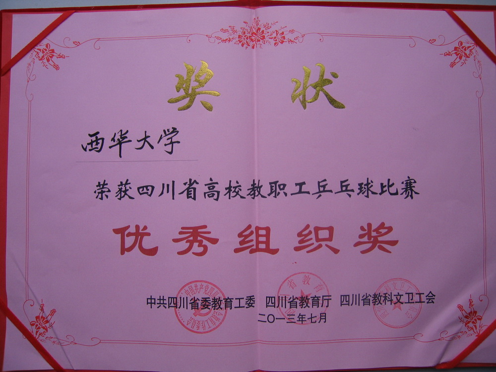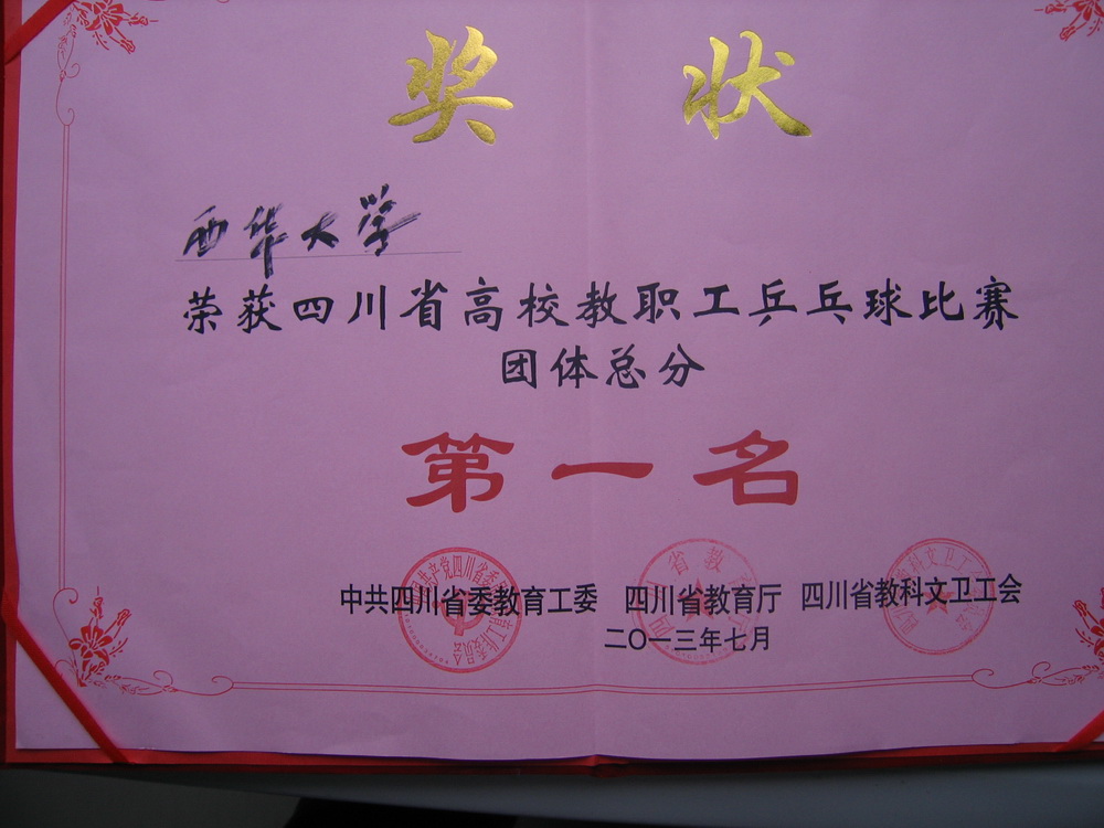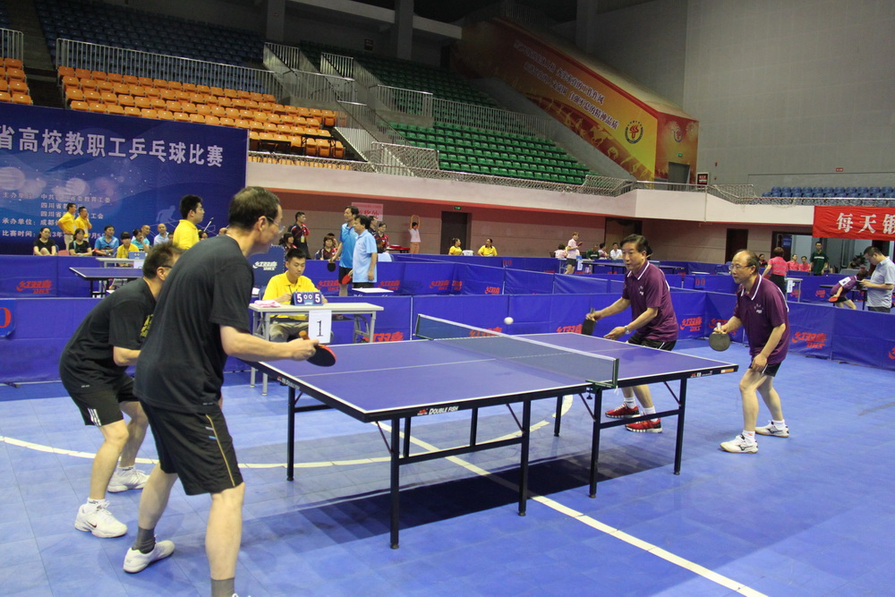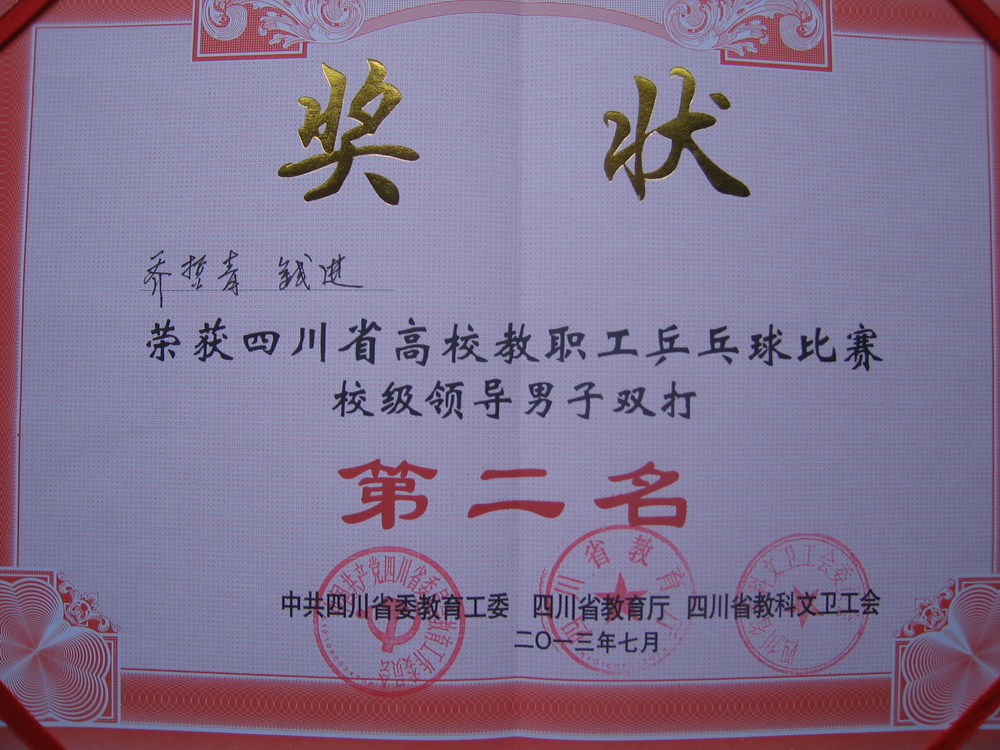 7月3日至5日,由省委教育工委、省教育厅、省教科文卫工会联合主办的2013年四川省高校教职工乒乓球比赛在成都体育学院举行。我校教职工乒乓球代表队一行在领队、校工会常务副主席王代言,乒乓球世界冠军、陈龙灿教练的带领下,与来自全省31所高校的近三百名教职工参加了本次比赛。经过激烈角逐,我校副校长乔哲青与正厅级调研员钱进获得校级领导组男子双打第二、教职工组获得团体总分第一的好成绩,学校获优秀组织奖。