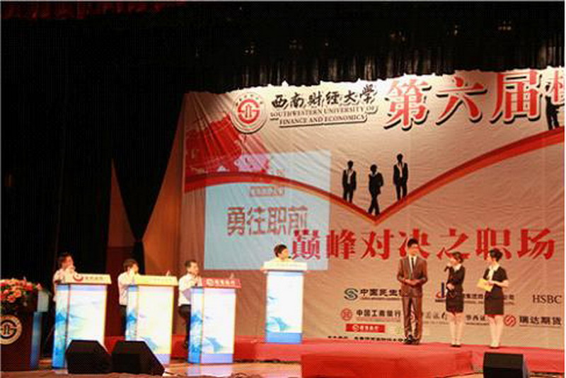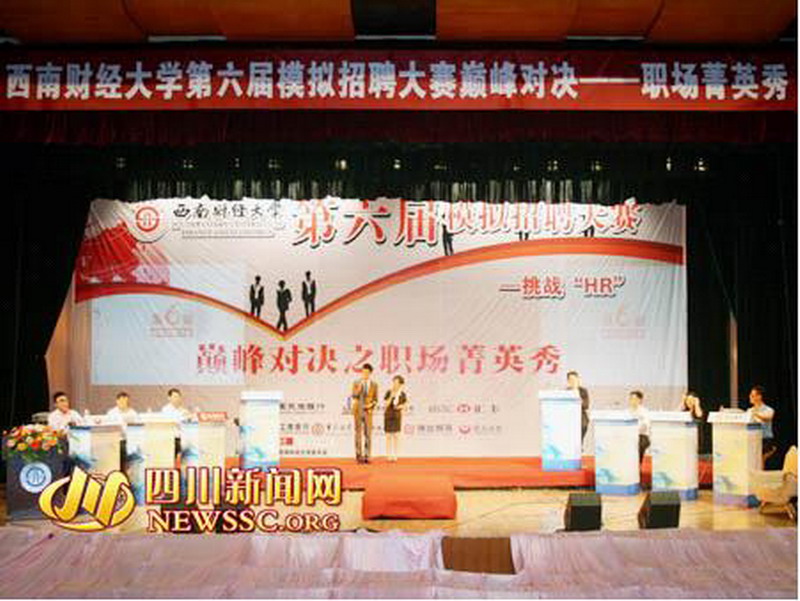 5月29日晚,第六届模拟招聘大赛巅峰对决赛在西南财经大学精彩上演。本届模拟招聘大赛由西南财经大学团委主办,我校经济与贸易学院与西财公管学院联合川大工管学院、西南交大经管学院、电子科大经管学院共同承办,并得到了民生银行、工行、汇丰、华西证券等多家知名企业的支持。我校经贸学子与来自西南财经大学、四川大学、电子科技大学的10名入围选手现场挑战各大企业的人力资源高管。最终,我校经贸学院谢祥松与姚健未在当晚的比赛中勇创佳绩,谢祥松获得三等奖,并得到华西证券的实习机会;姚健未获得最佳风采奖,并得到中国农业银行的实习机会。 模拟招聘大赛迄今为止已成功举办了五届,通过创设全真环境让学生们真切感受求职氛围,将职业生涯规划、职业测评、职业认证培训、就业指导等植入比赛环节,搭建起学生与企业的对接平台。大赛创办以来,参与大学生的人数逐年增加,支持企业持续增多,影响范围逐渐扩大,其意义和价值也在不断彰显。