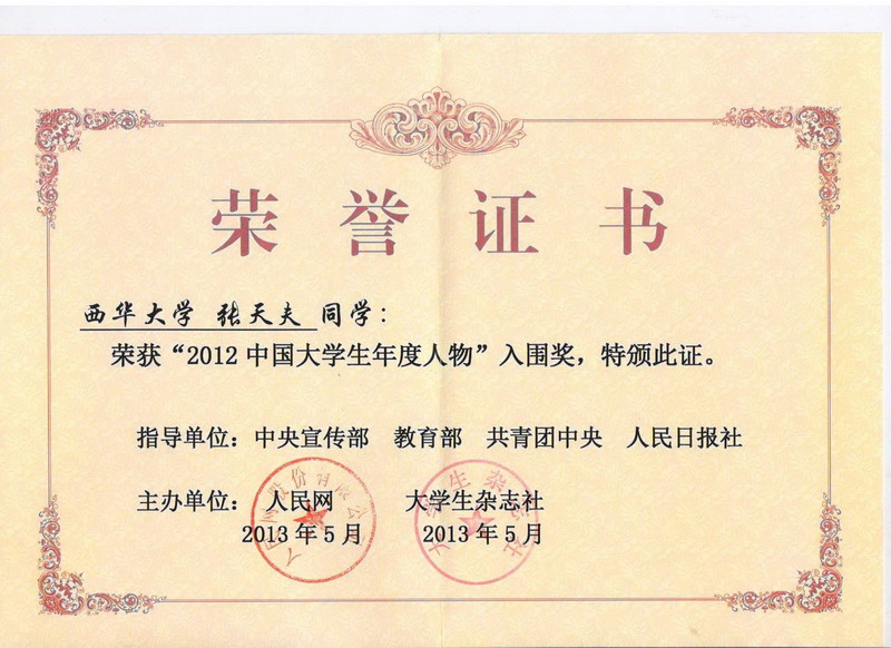 近日,由中央宣传部、教育部、共青团中央、人民日报社共同指导,人民网、大学生杂志社联合主办的“2012中国大学生年度人物”评选活动落幕,我校数学与计算机学院的张天夫同学荣获“2012中国大学生年度人物”入围奖。 “2012中国大学生年度人物”评选活动经历三个月的报名期,共收到全国536所高校推荐的799份报名材料。经专家评委审议,最终评选产生了年度人物10名和年度人物提名奖20名,年度人物入围奖170名。 张天夫同学是数学与计算机学院2010级软件工程专业学生,他创立了成都微力创意科技有限公司,公司目前有正式成员16名,其中博士生1名、硕士生两名,其余皆为本科生。公司主要经营项目为:AR增强现实的应用或游戏开发、安卓及IOS应用和游戏开发与网站建设。在创建公司之余,张天夫同学还在学校建立微力创意实验室,为同学们提供学习交流平台,目前团队已招新30余人。他曾获得“ITAT全国信息技术应用大赛”团队组国家二等奖、四川省大学生综合素质A级证书、电子科技大学“四川省软件邀请赛”金奖、“全国大学生英语综合素质竞赛”四川省银奖等荣誉。 中国大学生年度人物评选活动由教育部思想政治工作司发起,参选对象为全国全日制普通高等学校所有注册的中国籍学生(包括研究生、本科生、专科生)。活动旨在深入挖掘和宣传表彰大学生先进典型,集中展现当代大学生的精神风貌,充分发挥先进典型的示范引领作用,在全社会营造促进大学生健康成长的良好氛围。
