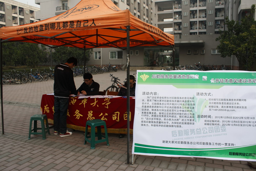 为了真实了解广大师生对后勤服务工作的需求,进一步改进学校后勤服务工作,提高后勤管理水平与服务质量,为学校的发展和构建和谐校园创造良好的环境,后勤服务总公司团委于12月3日至12月17日,通过发放后勤服务满意度调查问卷,就“校园环境、学生食堂、公寓管理、教学楼管理、学生浴室、开水供应”等方面进行了为期两周的“后勤服务满意度调查活动”。 后勤服务满意度调查现场 |