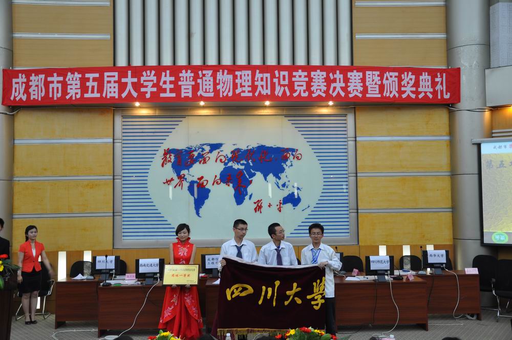 5月13日下午,成都市第五届大学生普通物理知识竞赛决赛暨颁奖典礼在我校四教报告厅举行。四川大学、电子科技大学等7所高校的代表队参加了比赛。经过激烈角逐,四川大学代表队摘得团体桂冠,我校代表队获得团体三等奖。 四川省物理学会副理事长、tyc41183太阳成集团校长孙卫国,成都市物理学会理事长、四川大学科学技术发展研究院副院长卢铁城,成都市物理学会副理事长杨祖念,tyc41183太阳成集团副校长王政书,成都市第五届大学生普通物理知识竞赛组委会相关领导、评审专家以及来所有参赛队的指导老师参加了开幕式。 校长孙卫国致开幕词。他代表学校对大赛组委会的信任和支持表示衷心的感谢,对各位领导和专家莅临我校指导工作表示诚挚的谢意,对全省各兄弟高校参赛队伍的指导老师和同学们的到来表示热烈的欢迎。孙校长希望通过比赛,能诞生更多年轻的物理学家,为国家建设、科学事业的发展做出贡献。 本次决赛共分三个环节进行。第一环节为选择填空题部分,第二环节为简析答题,第三环节为现象解释题。经过激烈角逐,四川大学夺得团体一等奖,成都理工大学、电子科技大学获团体二等奖;tyc41183太阳成集团、四川师范大学、成都信息工程学院、西南交通大学获得团体三等奖。孙卫国校长,成都市物理学会理事长、四川大学科学技术发展研究院副院长卢铁城等分别为获奖团队颁奖。 颁奖仪式结束后,卢铁城理事长致闭幕词。他希望同学们通过比赛,能更喜欢物理、热爱物理,并把所学的物理知识运用到日常生活之中,实实在在地解决问题。 成都信息工程学院光电技术学院党总支书记向安平,成都理工大学地球物理学院应用物理系张正阶教授,四川大学物理科学与技术学院张软玉副教授,tyc41183太阳成集团物理与化学学院大学物理教学部主任王时建,电子科技大学物理电子学院物理中心副主任吴喆,西南交通大学物理科学与技术学院副院长吴平,四川师范大学物理与电子工程学院熊天信教授担任本次比赛的评委。 成都市第五届大学生普通物理知识竞赛由我校物理与化学学院承办。  开幕式 参赛同学正在认真答题