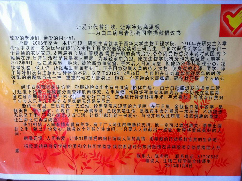 2012年12月31日,对我校生物工程学院2010级硕士研究生孙鹏同学来说,是不幸的一天,他被华西医院确诊为慢性粒白血病,并于当天收到病危通知书。得知消息后,我校师生纷纷伸出援助之手,爱心不断汇聚,截至目前,爱心捐款共计6万余元已送到孙鹏手中。 2010年,大四的孙鹏在研究生入学考试中,以第一名的优异成绩进入生物工程学院攻读硕士研究生,并多次获奖学金。他来自一个普通的农民家庭,父亲患有心脑血管梗塞,需要长期的药物治疗;爷爷因受伤感染未及时就医,现今瘫痪在床。为减轻其家中负担,生物工程学院为其提供勤工助学的机会,孙鹏立志靠自己的双手完成学业,从本科到研究生的6年多的时间里,他从未向家里要过一分钱。孙鹏是一位品学兼优的学子,专业知识和技能功底扎实,平日对待同学友善和睦,耐心为师弟师妹答疑解惑;在学院机房和实验室勤工助学时兢兢业业。 然而,要治好白血病,需要进行骨髓移植手术,手术费加上后续治疗费预计要40多万,对于年收入只有几千块的一个农民家庭来说,无疑是笔巨款。在得知这一不幸消息后,学校分管领导、学院领导和广大师生员工情系孙鹏,积极组织动员,竭尽全力筹集善款。学院领导积极向相关部门申请保险等资助;许多教师、本科生、研究生,以及已经毕业的校友主动捐款。截止2013年1月7日,学院师生代表将筹集到的5万元善款送至孙鹏手中。在此期间,每天都有老师和同学在医院看望、照顾孙鹏,为孙鹏置办日用品、购买急需药品。此外,还有一部分来自全国各地的校友的善款已打在孙鹏的银行卡上。 滴水之恩,涌泉相报。1月10日,孙鹏及其家属写下近千字的感谢信,对所有帮助过他和正在关心他的爱心人士表示感激之情。坚强的孙鹏并没有放弃对生活的向往,众多师生的支持和鼓励,让他更乐观坚强地面对病魔。他说:“我还没有报答含辛茹苦的父母,还没有感谢传授我知识和做人道理的老师,还有太多的事情没有做。等病好后,我最想回到学校,然后像帮助我的人那样去帮助别人。”