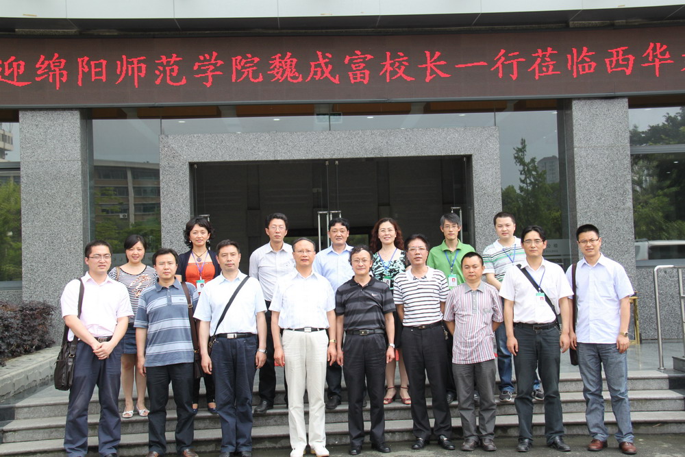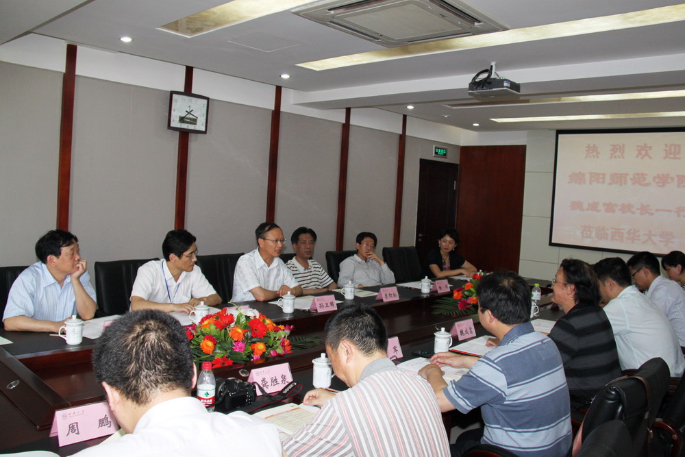 5月11日下午,绵阳师范学院魏成富校长带领学校党委办公室、校长办公室主任彭军,人事处处长唐再良,图书馆馆长龚胜泉等部门负责人一行到我校考察交流。校长孙卫国,副校长李劲松,校长办公室主任费凌、人事处处长杨伟、图书馆馆长吕先竞等相关部门负责人参加了在行政楼412会议室举行的座谈交流会。副校长李劲松主持座谈会。