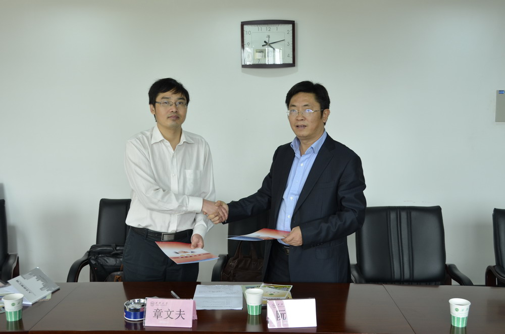 阮永生与章文夫(左一)签订人才供需和校地合作战略协议书