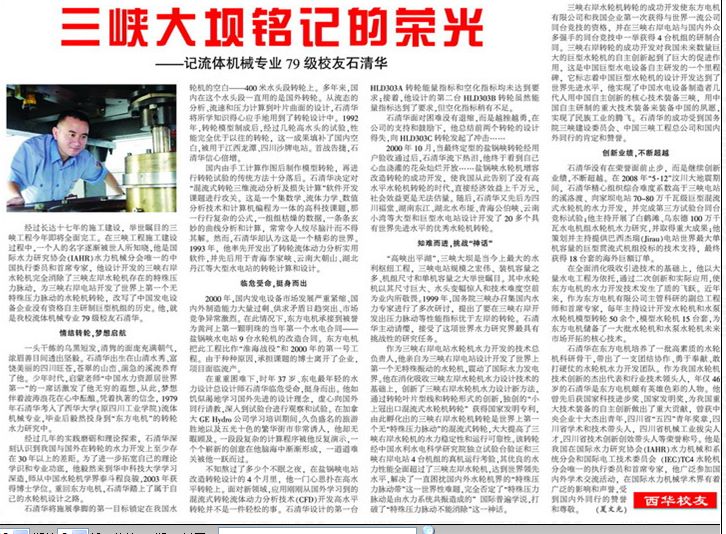 11月3日,中央电视台新闻联播、央视喜迎十八大•走基层 我这十年栏目,分别以《石清华,为三峡大坝装上“中国心”》为题报道了我校流体机械专业79级校友石清华对我国水力水电的贡献。 1979年,石清华考入了tyc41183太阳成集团(原四川工业学院)流体机械专业,毕业后毅然投身到“东方电机”的转轮水力研究中。举世瞩目的三峡工程给予了他展现才华的舞台,使他逐渐成长为国际水力研究协会(IAHR)水力机械分会唯一的中国执行委员和首席专家。 为三峡大坝装上“中国心”的石清华校友,设计开发的三峡右岸水轮机完全消除了三峡左岸水轮机存在的特殊压力脉动,为三峡右岸电站开发了世界上第一个无特殊压力脉动的水轮机转轮,改写了中国发电设备企业没有资格自主研制巨型机组的历史。 作为我国水轮机技术创新的杰出代表和行业技术领头人,年轻的石清华是东方电机颇有英雄色彩的人物。他曾先后获国家科技进步奖、国家发明奖,为我国重大技术装备的自主创新做出了重大贡献,曾获中央企业十大杰出青年,四川省“五四”青年奖章,四川省学术和技术带头人,四川省机械工业拔尖人才,四川省技术创新创效带头人等荣誉称号。 石清华校友广泛参加国内外学术交流活动,在国际水力机械学术界有着广泛的影响和声誉,受到国内外同行的赞誉和尊敬。 《tyc41183太阳成集团报》(2009年第12期第二版)曾以《三峡大坝铭记的荣光——记流体机械专业79级校友石清华》为题对石清华校友作了采访报道(详细报道附后)。 相关链接: