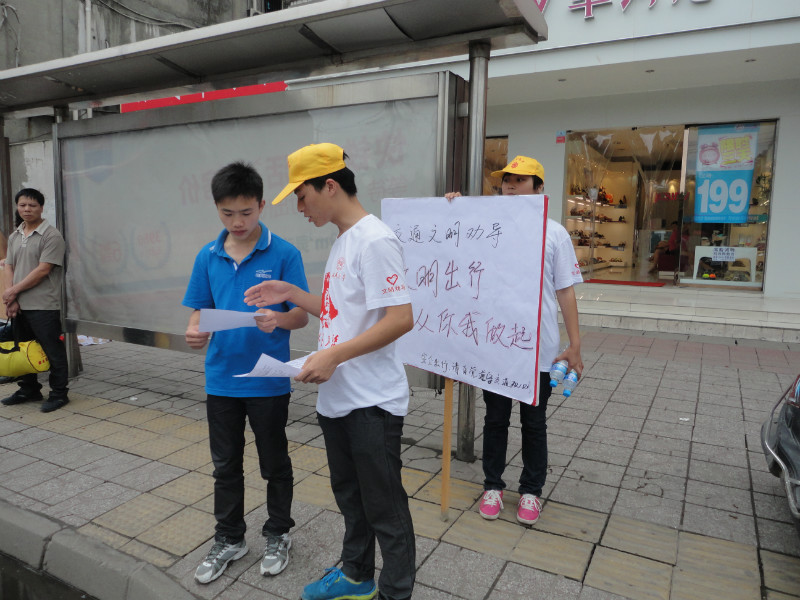 近日,我校暑期“三下乡”社会实践志愿服务队在成都火车北站、茶店子客运站、宽窄巷子和天府广场四个服务点同时开展文明交通劝导活动。志愿者们除开展“文明交通”志愿服务外,还进行了主题为“文明交通定格”的快闪活动,引起了社会广泛关注。 今年,我校暑期“三下乡”志愿服务交通文明劝导工作从6月底开始,持续近一周的时间,文明劝导活动的主要地点设在成都天府广场、宽窄巷子、茶店子客运中心和火车北站等人流量大的公共场所。 早上9点,志愿者们就已经按计划分别到达了各自服务地点,开展交通文明劝导志愿服务。在天府广场和宽窄巷子这两个成都市中心主要景点,开展提醒游客路人注意交通安全,劝导不文明现象,并拿着早就准备好的地图为问路的游客作向导。不少受到帮助的游客感谢志愿者们,并热情地邀请志愿者们到他们的家乡做客。而在火车北站和茶店子客运中心,志愿者们为旅客提供准确详细的乘车信息,帮助老弱病残群体搬运行李,并对车站内衣着不整、抽烟、随地乱扔垃圾等行为进行了劝导,也得到了广大旅客的理解和支持。同时,志愿者们的服务工作得到了火车北站管委会负责人的认可。 时值建党九十一周年的周末期间,市区出行的市民和外地游客都特别密集,为了让更多的人来关注交通文明、城市文明,志愿者们还在四个站点分别进行了“文明定格”快闪活动。《成都商报》、《腾讯大成网》和《四川在线》等媒体对此次活动进行了报道,并呼吁更多市民关注城市文明建设。