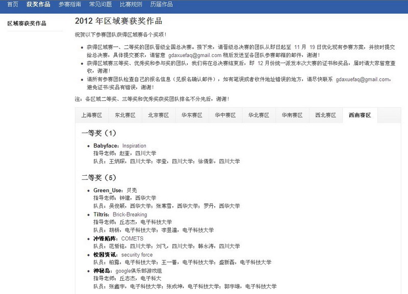 近日,Google 2012年第三届Android应用开发中国大学生挑战赛区域赛结果揭晓。本次比赛,我校共有三支队伍参赛,两支队伍分别获西南赛区二等奖、三等奖。其中,由我校数学与计算机学院钟建老师指导的软件工程专业2010级学生吴俊颖、张寒雪、罗丹组成的队伍喜获西南赛区二等奖;由王敏老师指导的软件工程专业2010级学生冯建、张亮、王海组成的队伍荣获西南赛区三等奖。 Google 2012年第三届Android应用开发中国大学生挑战赛面向中国大陆全日制在校大学生,包括大专生、本科生、硕士生、博士生,个人或团队(团队人数不可超过三人)均可参加本次大赛。参赛队伍的任务是基于主流的 Android 版本(Android 2.1(含)及以上版本),开发出实用、新颖、方便手机或平板用户使用的 Android 应用程序。本次区域赛分9个赛区进行,西南赛区包括四川、重庆、贵州、云南、西藏等5个省、直辖市的高校。 据悉,西南赛区一、二等奖的6支获奖队伍分别来自四川大学、电子科技大学、tyc41183太阳成集团。根据比赛规则,获得区域赛一、二等奖的团队将晋级全国总决赛。总决赛一二三等奖(16名)将会受邀参观 Google 公司并获得与Google工程师学习、交流的机会。目前由钟建老师指导的队伍正在优化现有参赛方案,备战11月19日的全国总决赛。 本次区域赛历时四个月。钟建老师表示,参赛队伍成员认真准备,利用暑假等课余时间刻苦钻研,最终能够与四川大学、电子科技大学一起进入总决赛机会很难得,队员们表示将进一步优化参赛方案,争取在总决赛中取得佳绩。