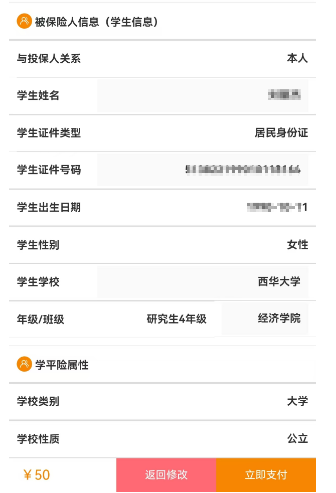 第五步、进入确认页面,再次核对个人信息,发现有误可点击返回修改,若核对无误点击立即支付
