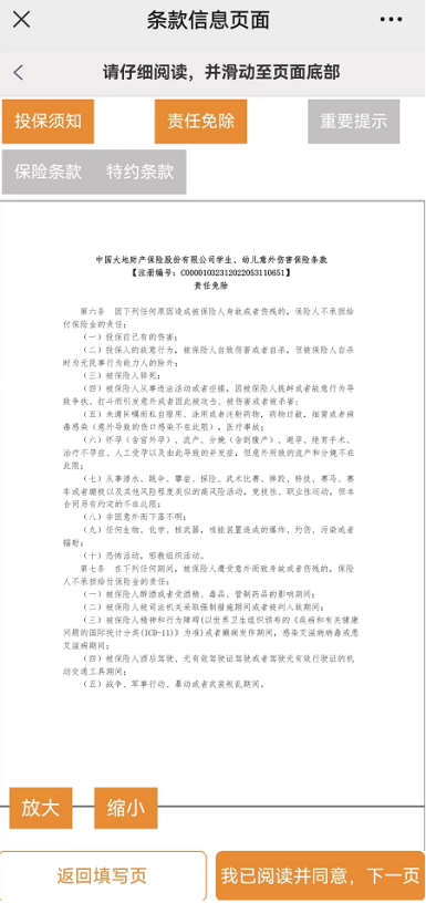 第四步、阅读条款,从《投保须知》开始点击进入,需阅读完所有内容,点击“我已阅读并同意,下一页”,直到阅读完毕,方可返回填写页进入下一步
