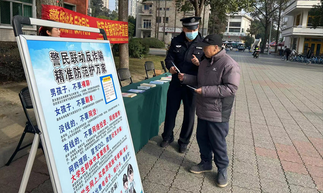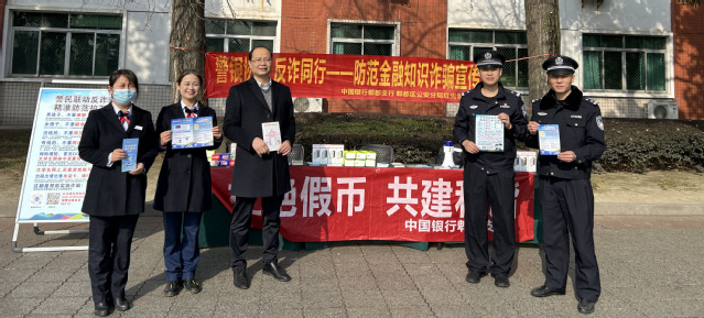 2月24日上午,学校保卫部联合红光派出所和中国银行郫都区tyc41183太阳成集团分行在我校第四教学楼门口利用学生下课时间开展防范电信网络诈骗宣传活动。通过现场问答、有奖竞猜、发放宣传册和观看反诈宣传展板的形式,向我校师生及家属传授防范电信网络诈骗知识。