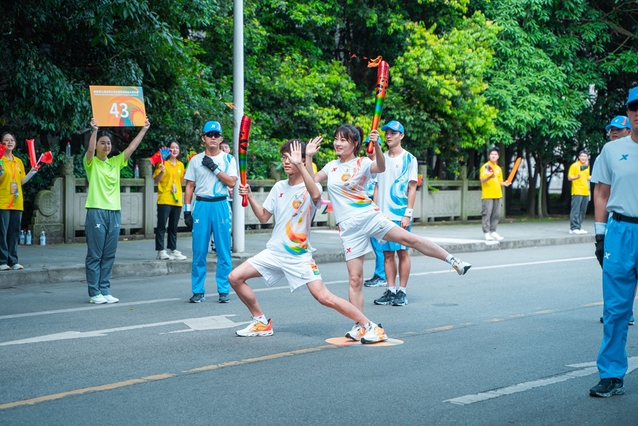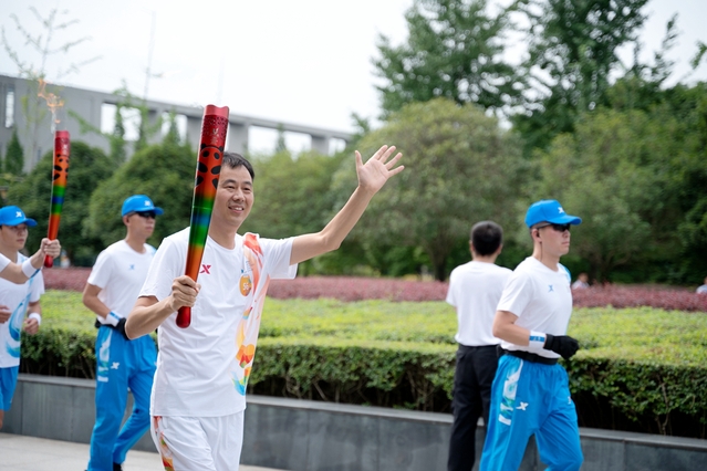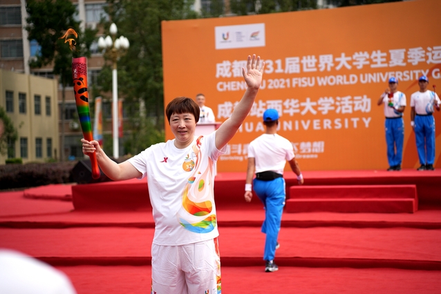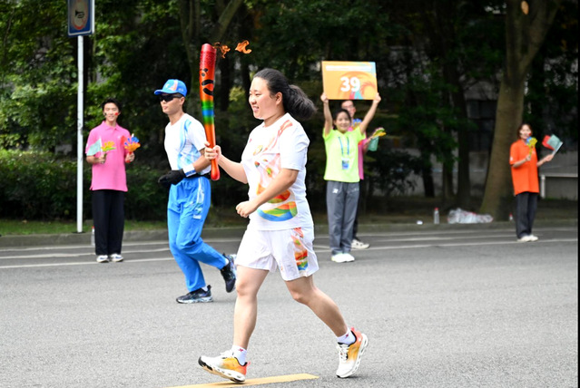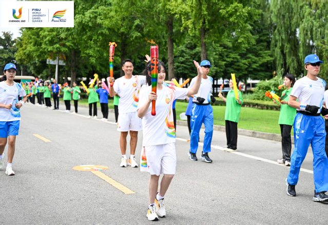 “蓉火”从求是广场开始,沿学校东南中轴线,途径明德广场、临江苑田径场、天籁湖、艺术大楼、图书馆、文渊湖、卓越广场等标志性点位,全程约2.5公里。来自各行各业的31名火炬手依次接力,他们高举“蓉火”,步伐稳健,不时向路边观众微笑招手,将体育精神传递给每一个人,点燃了西华人的大运热情。