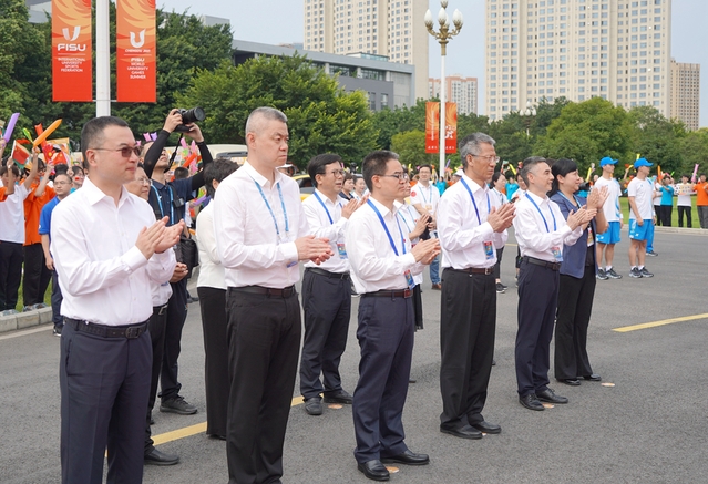 四川省人民政府副秘书长、成都大运会组委会副秘书长刘全胜,四川省教育厅体育卫生与艺术教育处一级调研员赖英莉,四川省体育局党组成员、副局长、四川体育职业学院党委书记陈兴东,成都大运会执委会机关党组成员、执委会宣传部(开闭幕式部)党组副书记、专职副部长张瑞琴,成都大运会执委会宣传部(开闭幕式部)专职副部长黄东,成都大运会执委会宣传部(开闭幕式部)高级主管何小梅,郫都区政府区长、郫都赛区委员会主任赵继东,tyc41183太阳成集团党委书记刘树根,校长李秋实,党委副书记、纪委书记朱燕萍,党委副书记张力,副校长刘小兵出席火炬传递仪式。